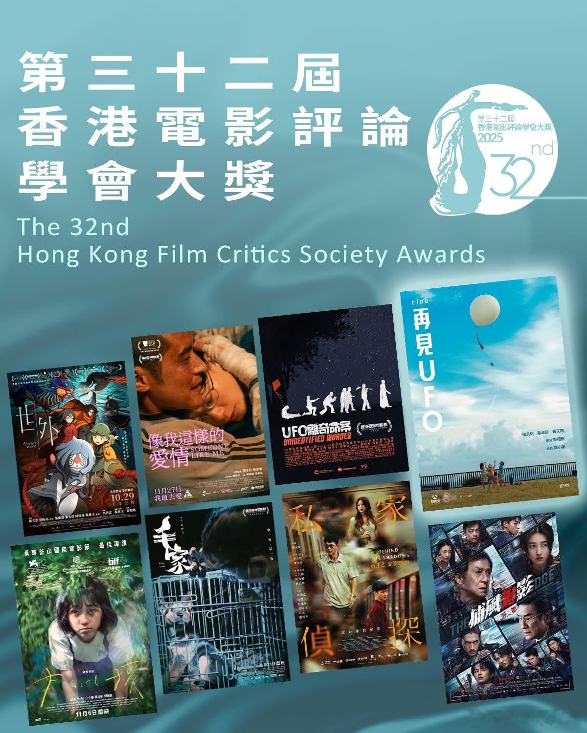 香港电影评论学会评出2025年度五项大奖及六部推荐电影——最佳男演员:古天乐(私家侦探)最佳女演员:廖子妤(像我这样的爱情)最佳电影:《再见UFO》最佳导演:李子俊、周汶儒(私家侦探)最佳编剧:郭家喜、李振杰、何肇康、蔡嘉桁(UFO离奇命案)推荐电影六部(最佳电影以外的推荐奖):《UFO离奇命案》《私家侦探》《女孩》《毛家》《世外》《捕风追影》