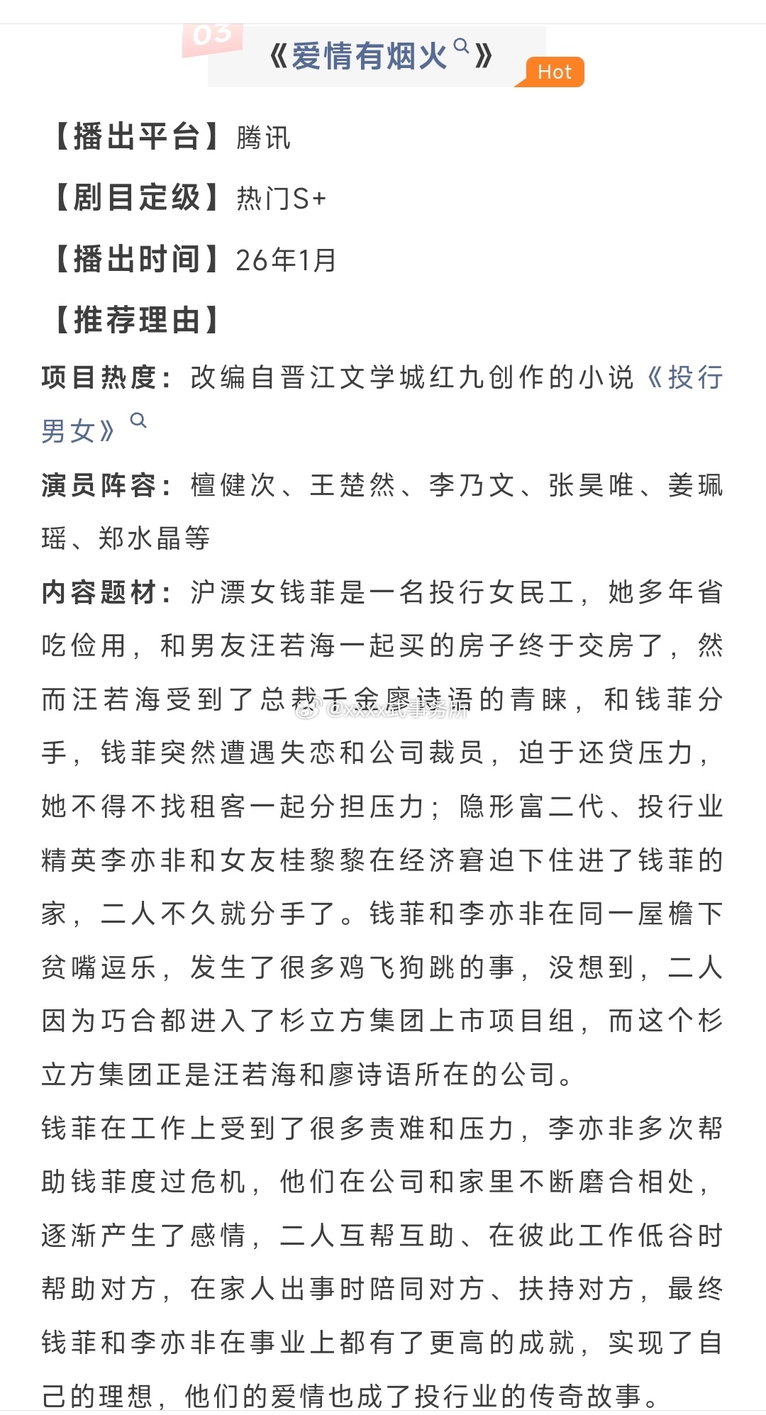 檀健次 王楚然《爱情有烟火》项目看点【播出时间】26年1月