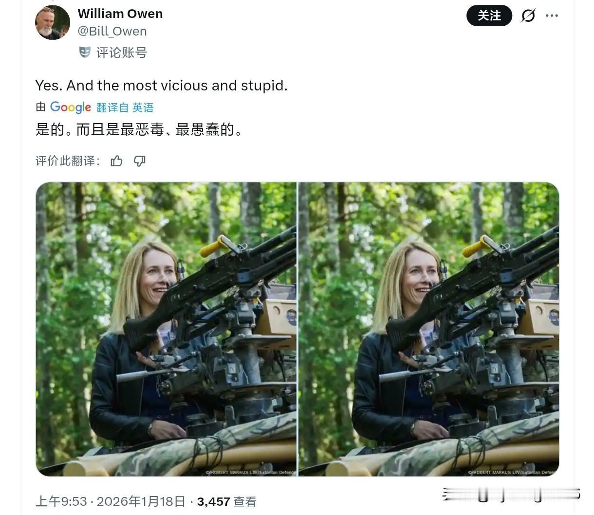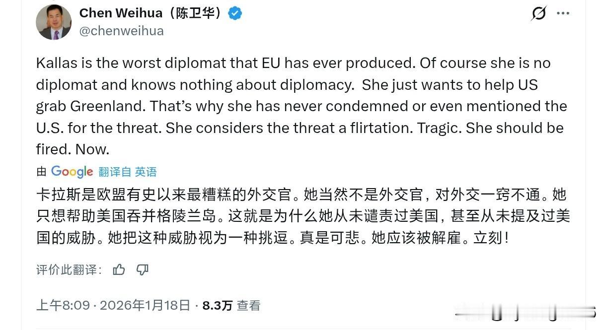 卡娅·卡拉斯真是个奇葩!美国对欧洲发动了一场史无前例的贸易战。她本该从自身利益和弊端的角度来衡量这场贸易战。 但她衡量的标准仍然是这场贸易战对俄罗斯和中国是好是坏!所以,这个女人存在的全部意义似乎就是想方设法地伤害俄罗斯和中国! 还得是陈卫华,火力全开(图二),另外一个老外的加图片评论(图三)。