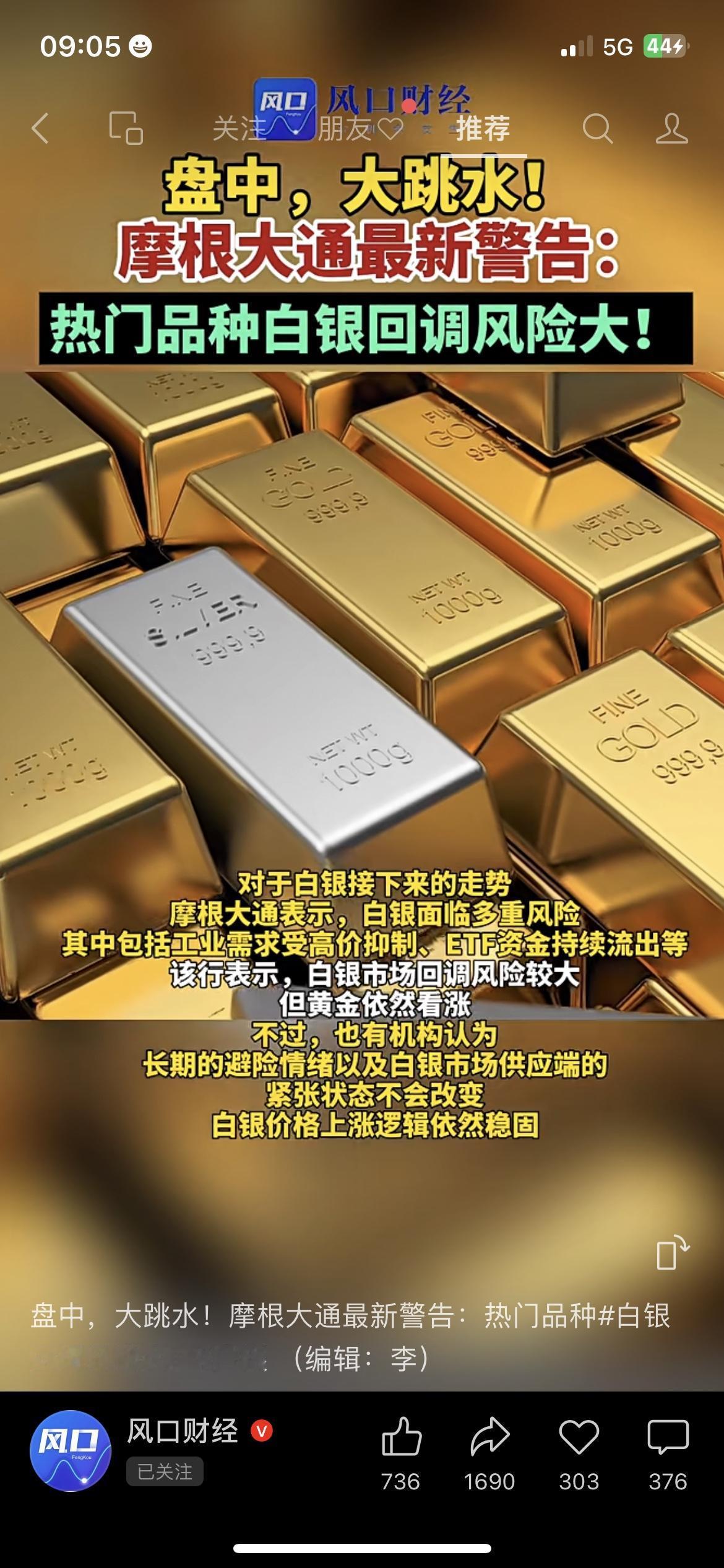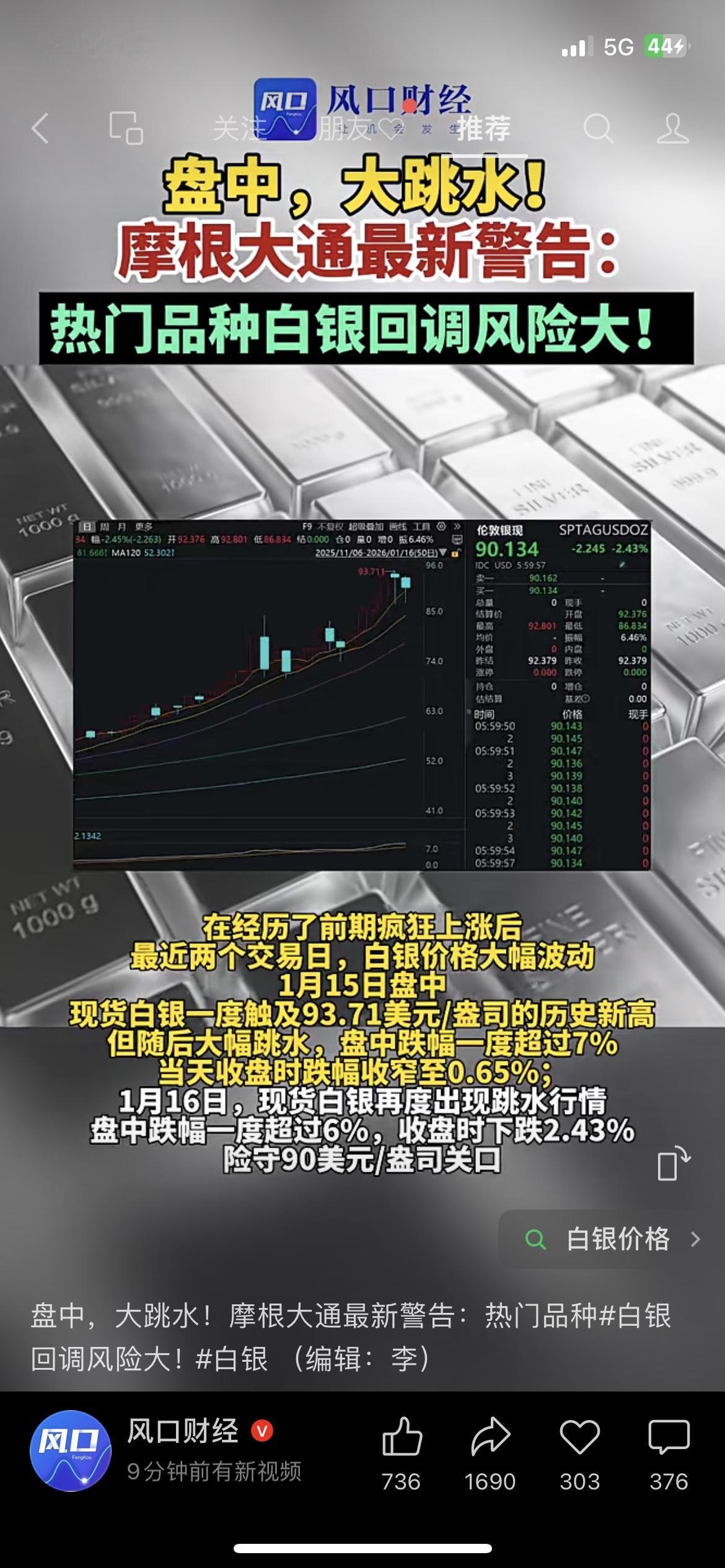 突发!白银大跳水!追高的都懵了! 白银突然大跌,摩根大通早预警过回调风险!我同事上周跟风买了白银基金,现在亏得睡不着,悔得拍大腿!懂的都懂,贵金属看着稳,跌起来根本扛不住。 投资不贪心,才能不亏心。 市场有风险,投资需谨慎。 你手里有贵金属理财吗?这次亏了没? 白银跳水 投资避雷