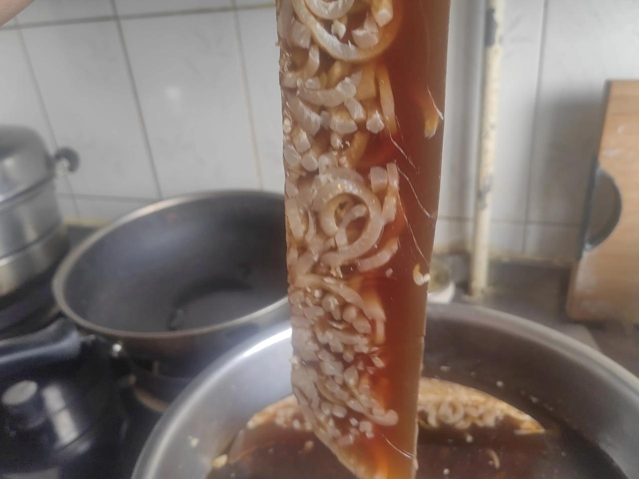 自己动手丰衣足食,自制的猪皮冻又好吃又便宜。 今天上午去北京五道口菜市场,买了7斤多五花肉,11块钱一斤,比小区附近的超市一斤便宜6块钱。 顺便买了10斤猪皮,3块钱一斤,自己做猪皮冻。 10斤猪皮熬了大半盆,放到了阳台上,把窗户打开,3个多小时就凝固好了,晚上就吃上了。 我做的是蒜香味的猪皮冻,非常成功,吃到嘴里Q弹Q弹的,口感非常好。 猪皮冻做法简单,调点醋汁,既可以当下酒菜,又可以当咸菜。 喜欢吃的朋友,可以自己做起来。