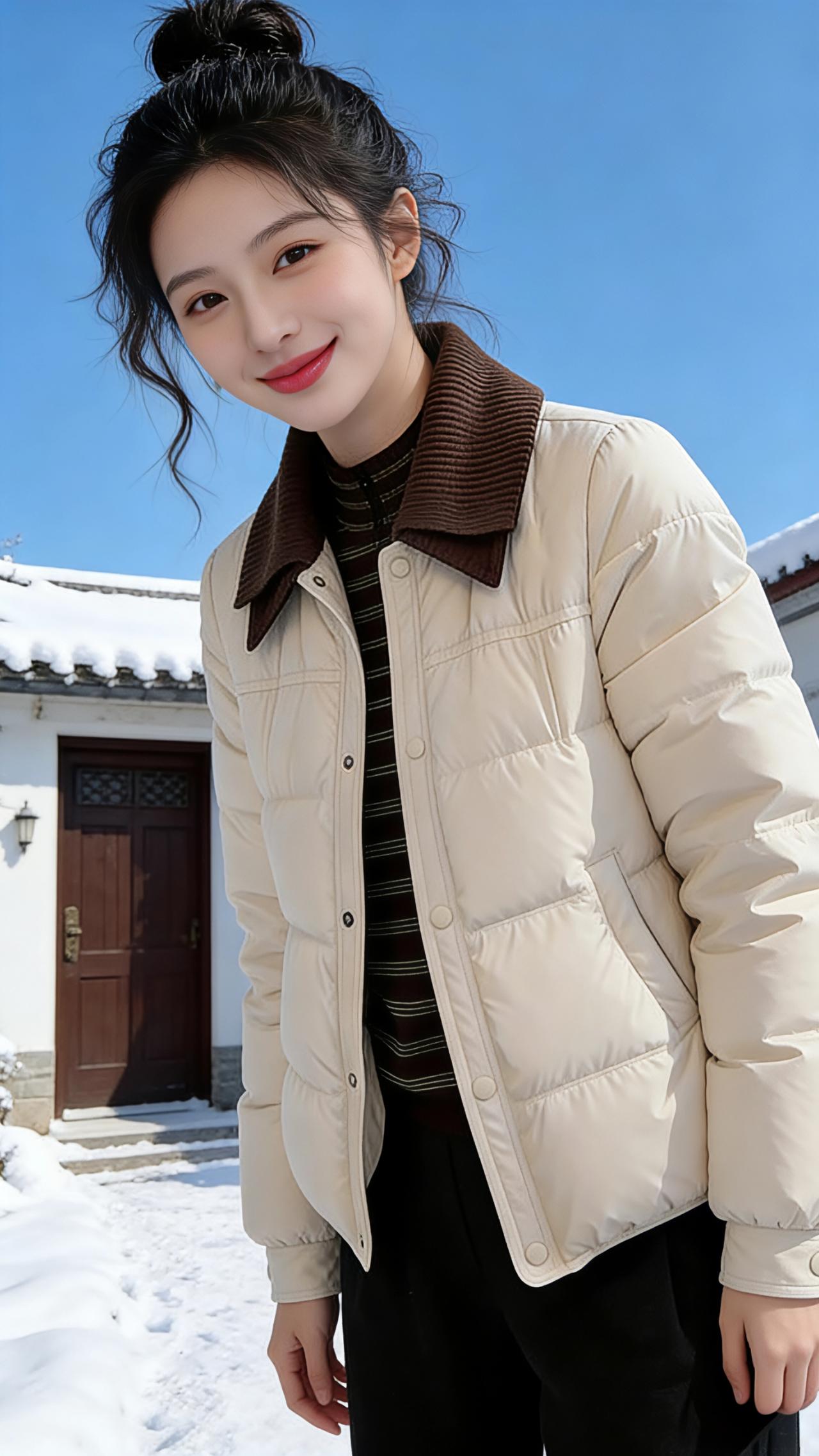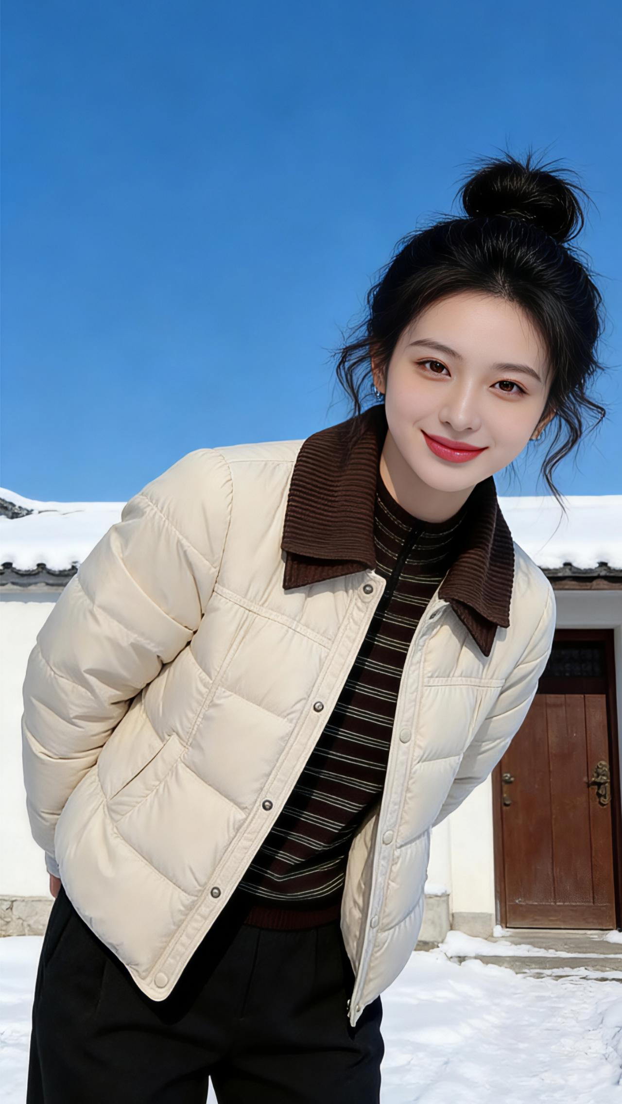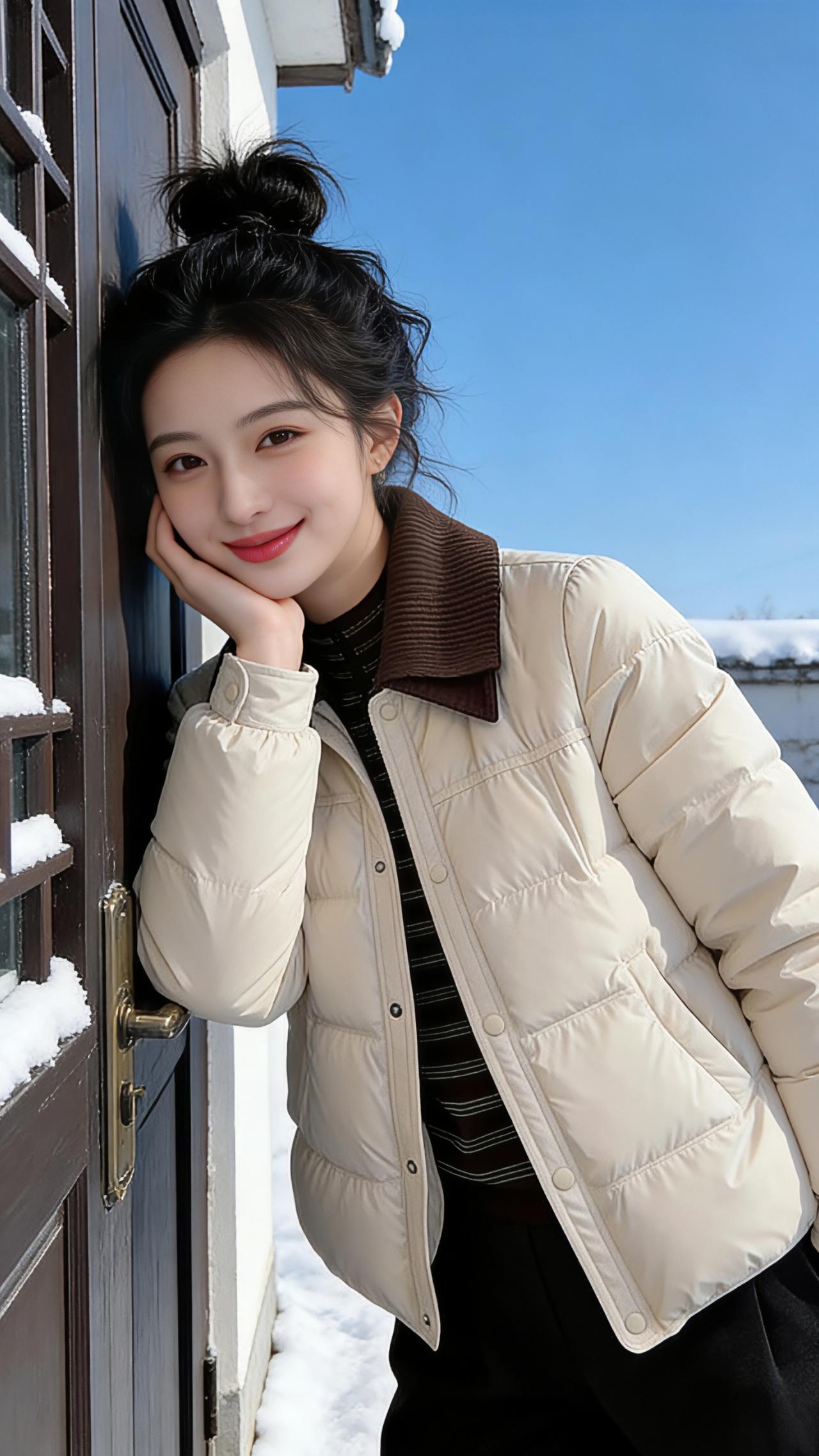 雪日暖歌 雪落满了白墙黛瓦的小院,檐角的积雪在晴光里泛着温柔的光。我裹紧米白色的棉服,深棕色灯芯绒领圈恰好抵着颈窝,把料峭的寒风都隔在衣外。 院门外的雪地还留着昨夜新雪的痕迹,蓬松得像团揉碎的云。我把双手揣进棉服口袋,暖意顺着布料漫开,脚步便也轻快起来。歪头靠在深褐色木门上,冰凉的木纹贴着脸颊,倒生出几分俏皮的亲昵。 抬头是万里无云的晴空,蓝得像被雪水洗过的宝石。阳光穿过发梢,在蓬松的棉服上落下细碎的光斑。我微微俯身,任影子在雪地上拉得又细又长,风掠过耳畔时,竟带着几分清甜的凉意。 原来冬日不必总是凛冽,一件暖和的棉服,一方晴好的蓝天,就足以让寻常日子变得温柔又闪亮。 高级感穿搭 冬季穿搭 随意穿搭 棉衣棉服
