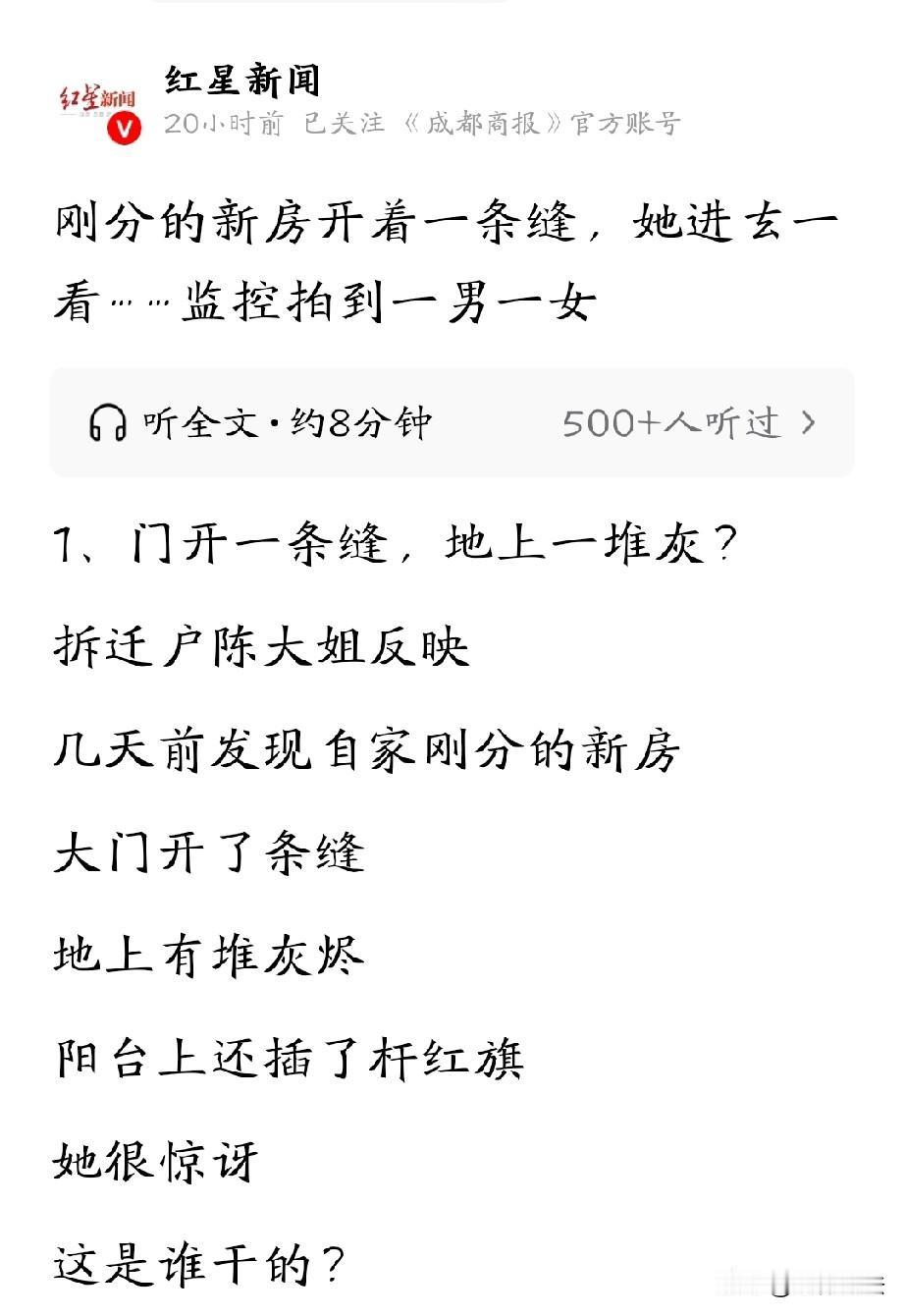 浙江杭州,女子家的回迁房刚分到手,她高高兴兴的去看房,却发现自家新房门开了条缝,女子往里仔细一瞧,竟然发现客厅地上有烧过纸的灰烬,阳台上还插了一根红旗。女子瞬间懵了,赶紧跑到物业调监控,竟发现是隔壁一对母子走错房子,还按照当地风俗在里面烧了元宝,破了土。自家风水被破坏,女子无法接受,要求换房,谁知,对方的态度让她气愤不已。 几年前,陈大姐家遇到拆迁,不久前,终于分到了回迁房,还是毛坯交付,她心里别提多美,开心满心欢喜的规划新生活。 今年1月8号,陈大姐来看新房,谁知走到门口,竟发现大门开了条缝,自己的房子,谁会在里面呢? 她试着轻轻推开门,往屋里一看,当时就懵了,客厅地上有摊黑乎乎的东西,阳台上还插着一杆小红旗。 陈大姐吓个半死,还以为不是自己的房子,赶紧往楼下跑。 到了楼下,她确认是13栋后,没走错,又硬着头皮上来,并拿出手机拍了视频。 视频显示,一进屋就看到到了那堆黑乎乎的东西,用脚扒拉几下,感觉像是纸烧了之后留下的灰烬,阳台上原本还插了杆红旗,不过这会儿没见着。 陈大姐又惊又气,这是谁干的,好好的新房,怎么弄成这样,太不吉利了。 陈大姐当时就报了警,还让物业调出监控录像,并将此事反应给了记者。 物业发来了几段视频,监控里显示,当时一名穿白色外套的男子手插口袋走进单元门,后面跟着一名红衣女子,拿着两个黑色塑料袋和一个红色塑料袋,袋子后面似乎还有根杆子。 可这段监控视频,只能证明那一男一女进过单元,但陈大姐说自己看过完整视频,他们两人从电梯走出来,就直接走进了自家新房,并在里面烧纸。 为了验证陈大姐的说法,大家找到物业消控室想要查看完整视频,但遭到工作人员拒绝。 他们又赶到物业办公室,管家也是支支吾吾。 陈大姐解释说,因为是新房,所以钥匙是物业保管,自己来看房子时,说要维修,物业才给她开的门。 她觉得,既然钥匙是物业保管,物业就该负责开门和锁门,确保安全。 物业解决不了,无奈之下,陈大姐便将此事反映给了村里的书记。 在书记的协调和帮助下,民警很快查明,男子也姓陈,他说不小心走错了,还说烧的是“元宝”。 原来,那一男一女是母子俩,他们分到的房子紧挨着陈大姐家,一个02户,一个03户。 钥匙交给物业后,物业交给了施工单位维修,母子俩没注意走错了,进到了陈大姐家,施工单位的维修人员以为来的是业主,双方就各干各的。 陈大姐气得不行,他们当地有风俗,开始装修前要挑个好日子“破土”,现在好了,别人在她新房里“破土”烧了“元宝”,她觉得,这房子的风水被破坏了。 所以,陈大姐要求,跟男子陈某家换房子,因为他家没动过,而自家房子已经烧过元宝,破过土了。 谁知,陈某却说房子不是自己的,他做不了主。 一百多万的房子,被搞坏了,这口气她咽不下,吃不下睡不着。 思来想去,既然房子换不了,陈大姐要求对方必须赔偿她几万块钱。 其实,陈大姐也承认这是迷信,但这祖祖辈辈传下来的风俗,她心里就是过不去这道坎。 《民法典》第1165条规定:行为人因过错侵害他人民事权益造成损害的,应当承担侵权责任。 陈某母子认错房门号,误入陈大姐家新房,并烧了“元宝”,存在重大过失。 即便主观无恶意,但其未尽到核对房号、核实身份的基本注意义务,施工人员未核实业主身份便放任其在房内烧纸,也存在过失。 房屋内留存灰烬,虽未造成重大物理损毁,但结合当地“破土”风俗,该行为严重违背陈大姐的意愿,导致其产生强烈精神痛苦,属于法律认可的精神损害后果。 陈大姐主张的“风水损失”法律不予支持,但精神损害赔偿可依法获得支持。 陈某母子作为直接侵权人,应承担赔礼道歉、清除痕迹、赔偿合理精神损害抚慰金的责任。 陈某以“房子不是自己的,做不了主”为由拒绝担责,说不过去。 《民法典》第897条规定:保管期内,因保管人保管不善造成保管物毁损、灭失的,保管人应当承担赔偿责任。但是,无偿保管人证明自己没有故意或者重大过失的,不承担赔偿责任。 陈大姐将新房钥匙交由物业保管,双方形成钥匙保管合同关系。 物业将钥匙转交施工单位时,未履行告知业主、核实施工单位权限、建立钥匙交接登记制度等义务,属于保管不善。 所以,陈大姐还有权要求物业承担部分损失。 最后,村书记出面表示,会帮忙协调两户人家,大家邻里邻居的,先协商调解,希望能尽快圆满解决。