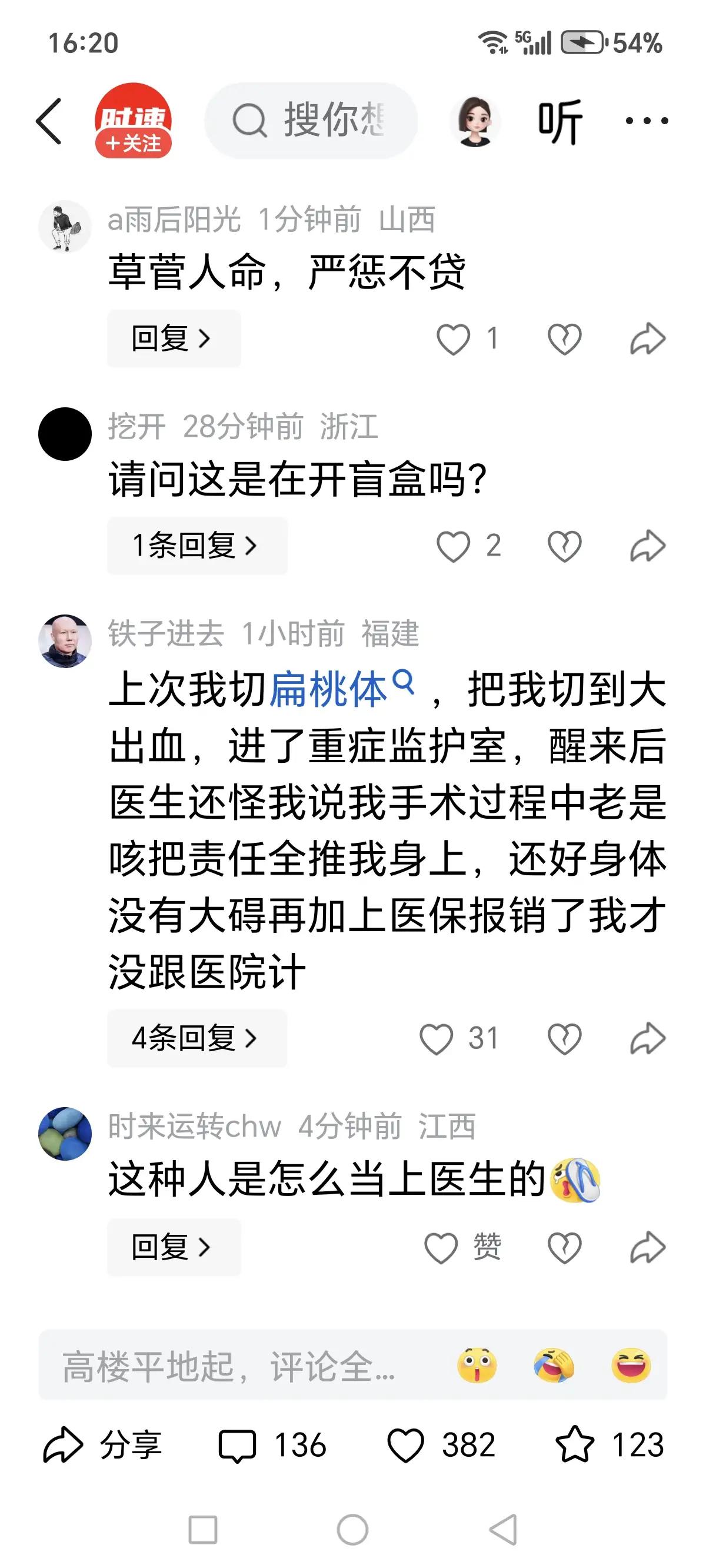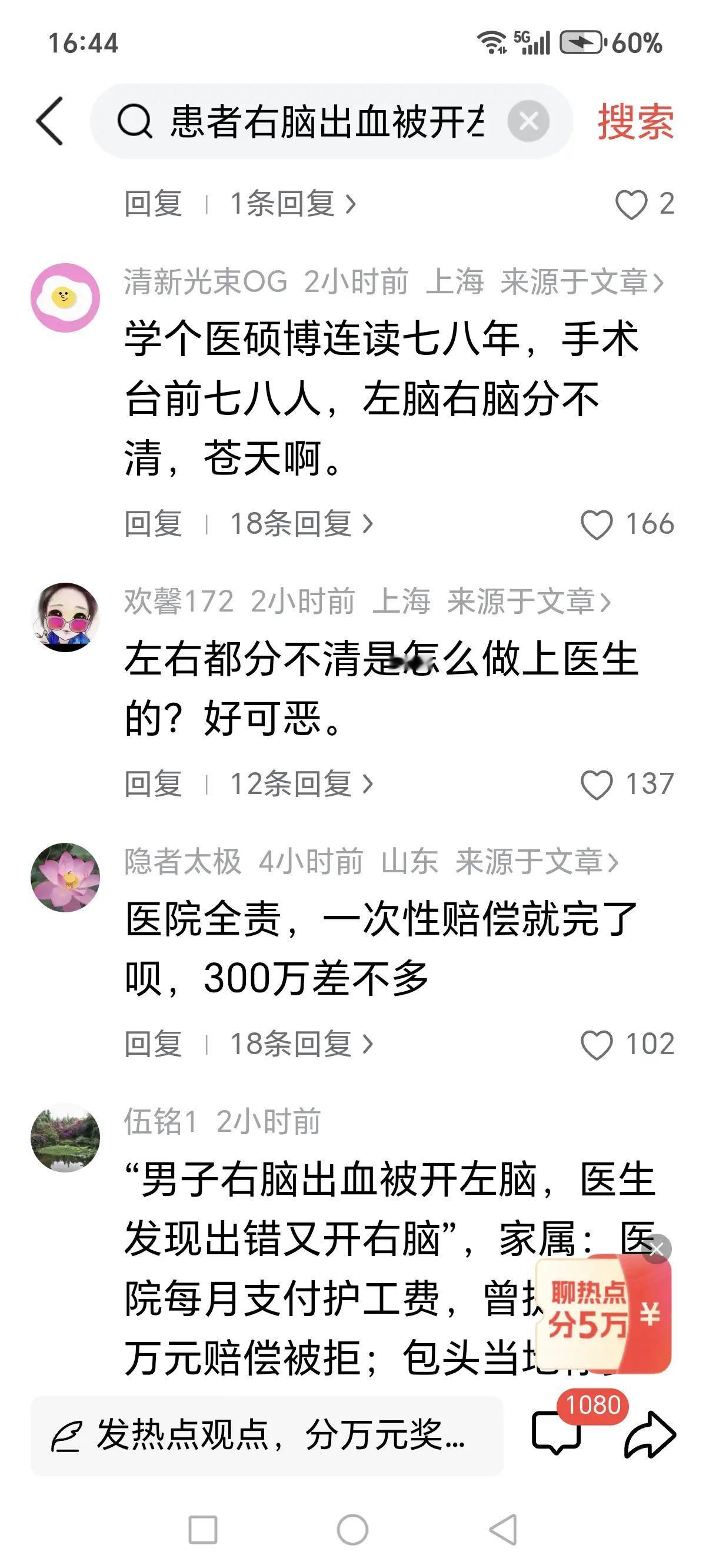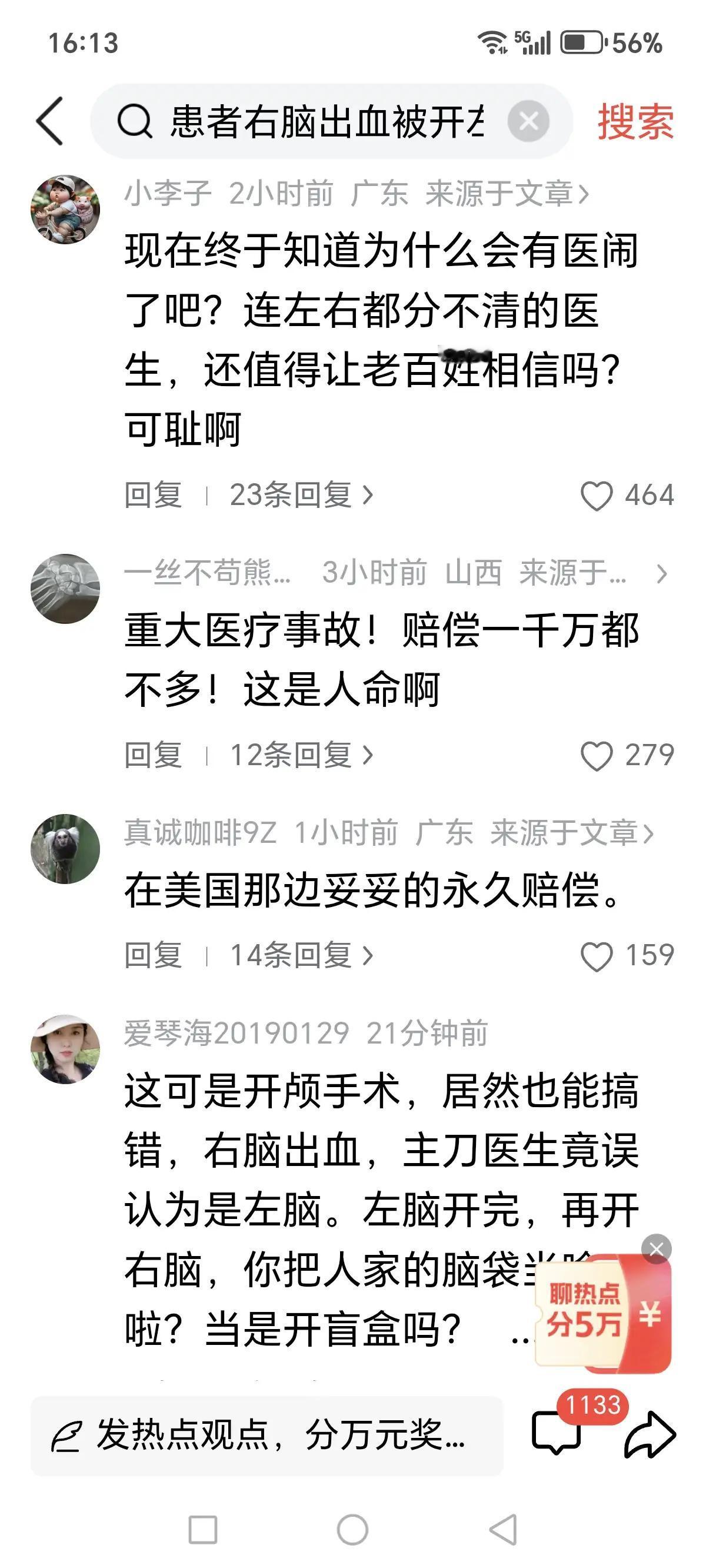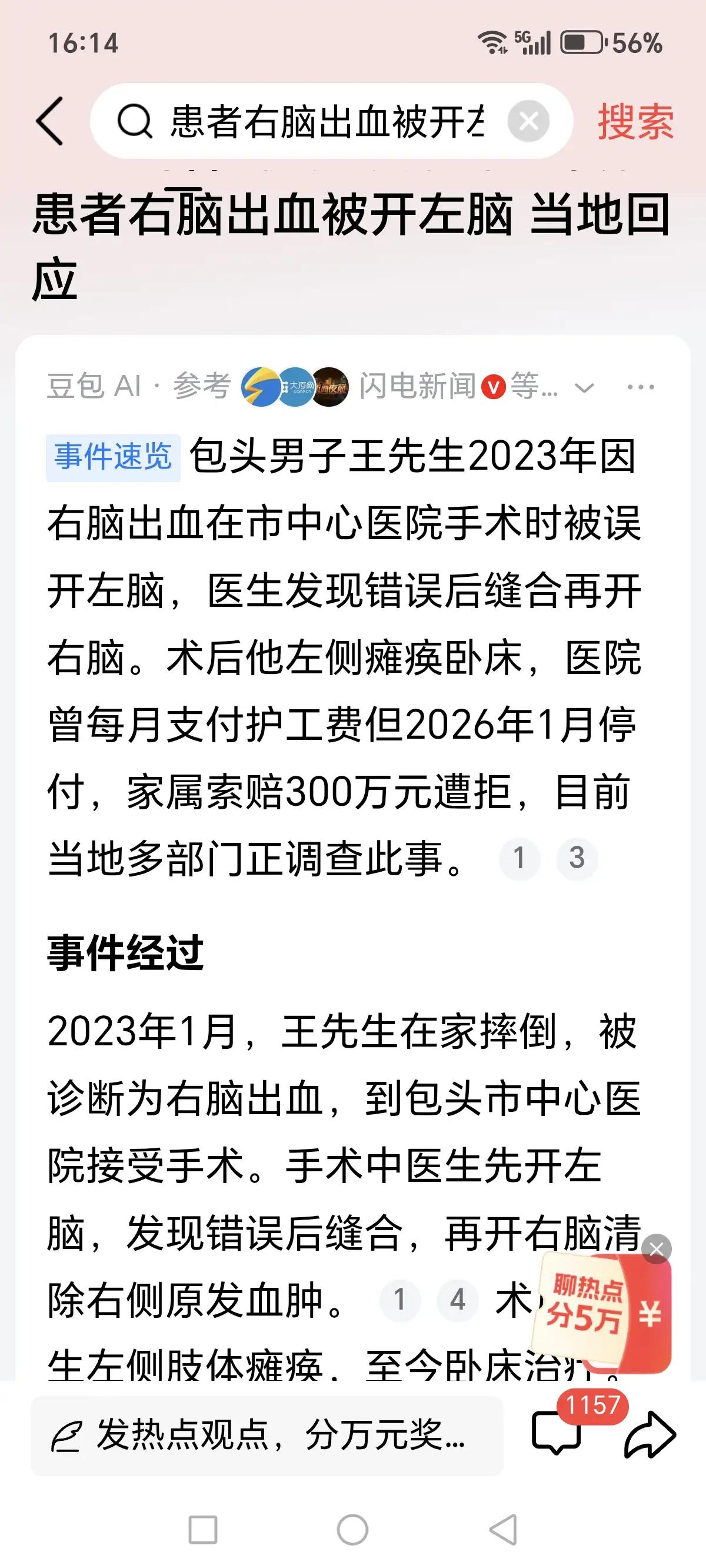 这个医生好恐怖,拿着人头当西瓜[震惊] 包头的王先生2023年1月,在家不小心摔倒,到包头市中心医院就诊,被诊断为右脑出血,在医院接受手术时,医生先开了左脑,发现错误后,缝合后又开了右脑,手术后造成王先生左侧瘫痪,医院也承认开错了,给他支付护理费,2026年1月不再支付,王先生的家属根据律师的计算,要求医院赔付300万,遭医院拒绝,原因是医院认为王先生的瘫痪是右脑出血造成的,与开错左脑无关。 王先生及家属不认可,现在双方正在调解之中。 这个事件,当错方肯定是医院,这是一起不折不扣的医疗事故,手术医生毫无责任心,甚至可以追究其法律责任,不管后期王先生的瘫痪与开左脑有无关系,都应该给予王先生一定的赔偿,至于赔多少,双方应理智的协议,如果协商不成功,可以走法律程序! 这起令人震惊的医疗事故,像一记重锤狠狠击打在公众的心头,也让我们不禁反思:医疗行业的责任到底在哪里?一名普通家庭的希望与信任,竟然在医院的“疏忽”中变成了无法挽回的悲剧。可是,事情的真相远比表面看到的更加复杂,也更加令人愤怒。 我们常说,医生是救死扶伤的天使,可当“天使”变成“魔鬼”,当医者的责任心被蒙上阴影,公众的信任也随之崩塌。王先生的案例,就是一个血淋淋的警钟。手术中出现的“失误”,不仅没有得到及时的纠正,反而变成了“责任推诿”的借口。医院一边承认开错了脑部,但在赔偿问题上,却以“责任不在手术错误”为由,拒绝承担应有的责任。这种态度,无疑是在伤害患者家庭的心,也在伤害整个医疗行业的公信力。 更令人心寒的是,医院的“推诿”背后,隐藏着多少制度上的漏洞?医生的责任心是否被制度所束缚?医疗事故频发,赔偿难,责任难追究,难道真的是“制度”出了问题,还是某些医者的职业操守出现了偏差?我们需要的,不仅仅是法律的公正,更是每一位医者的良知和责任感。 这个事件,也让我们看到,公众的维权意识在逐渐觉醒。王先生的家属不甘心接受“责任推脱”,坚决要求合理赔偿,彰显了普通人面对不公时的勇气和坚持。法律的介入,是他们维护权益的最后一道防线,也提醒我们:在面对不公时,不能一味忍让,而要用法律武器捍卫自己的权益。 当然,事情的背后也值得我们深思。医疗行业的“安全线”究竟在哪里?如何避免类似悲剧的再次发生?或许,除了制度上的完善,更需要每一位医者心中那份对生命的敬畏和责任。只有这样,患者才能真正感受到“医者仁心”,而不是“恐怖的手术场景”。 这起事件,是一面镜子,映照出我们对医疗安全、职业道德、制度保障的期待。也希望,所有医者都能以此为戒,回归初心,用行动证明“救死扶伤”的真正意义。毕竟,生命无价,没有任何一个“疏忽”可以用金钱来弥补。我们期待,正义终将到来,受害者得到应有的公正与关爱。脑摔伤病人