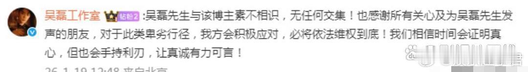 吴磊 不认识不认识,已委托律师依法追责。” 随后,吴磊工作室转发并评论:“吴磊先生与该博主素不相识,无任何交集!”还称将依法维权到底。