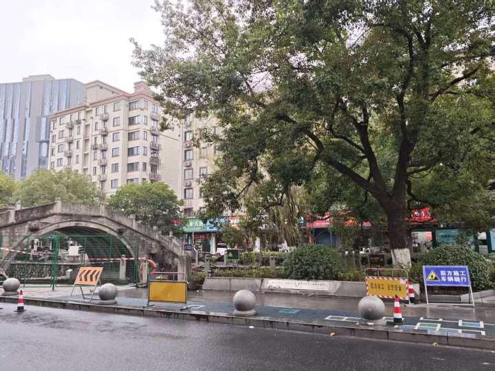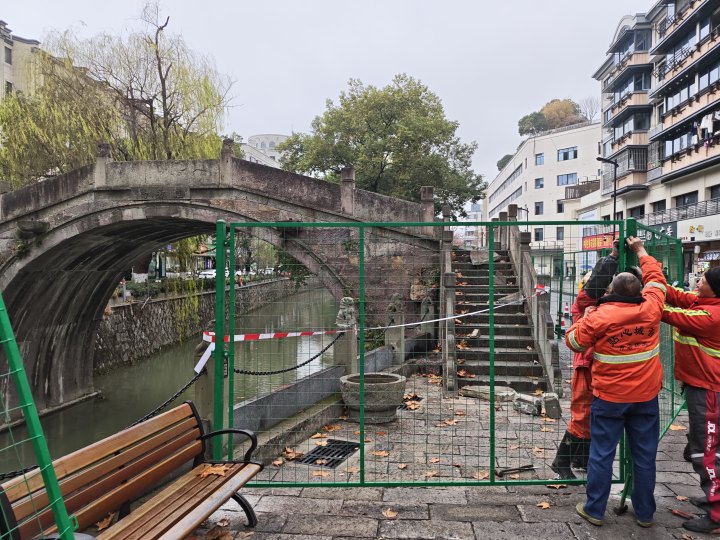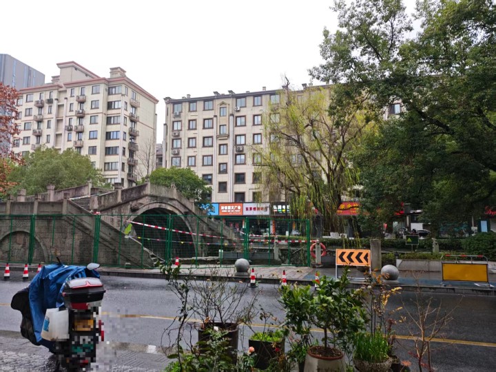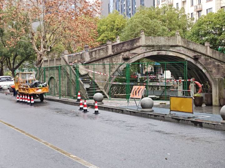 今天中午1点30分,橙柿互动记者来到了临平区桂芳桥旁的东大街。这片区域是单行道,桂芳桥架在东大街和河南埭路之间,已被红白色警戒线围上。桥下是上塘河,沿线挂着不少游泳圈,旁边还有一些写着“前方施工,注意安全,车辆绕行”的警示牌,工作人员正在给桂芳桥立绿色围挡。