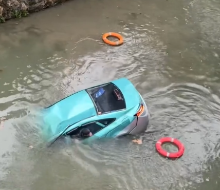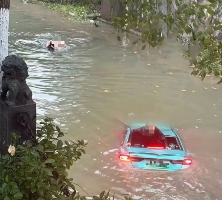 从视频和图片来看,绿色出租车掉进河里后,车头向下倾斜,车体还在下沉,车内司机和乘客正努力从车窗逃出,岸边的好心人往河里抛救生圈。很快,一个黑衣男子跳进河里,拿着救生圈奋力往下沉的车子游去,协助司机和乘客逃生。车子落水不到3分钟,司机和乘客两人都顺利救出。