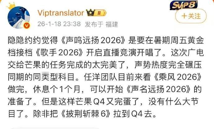 声鸣远扬总冠军内定歌手2026首发冠军夜未至,资源已拉满!节目过半选手通告不断,五进四锁定各大卫视春晚,三强冲刺夜后,网传总冠军将直通《歌手2026》揭榜!危晋宇、张卓尔、高旭谁能夺冠?芒果捧新人的资源也太给力了!声鸣远扬