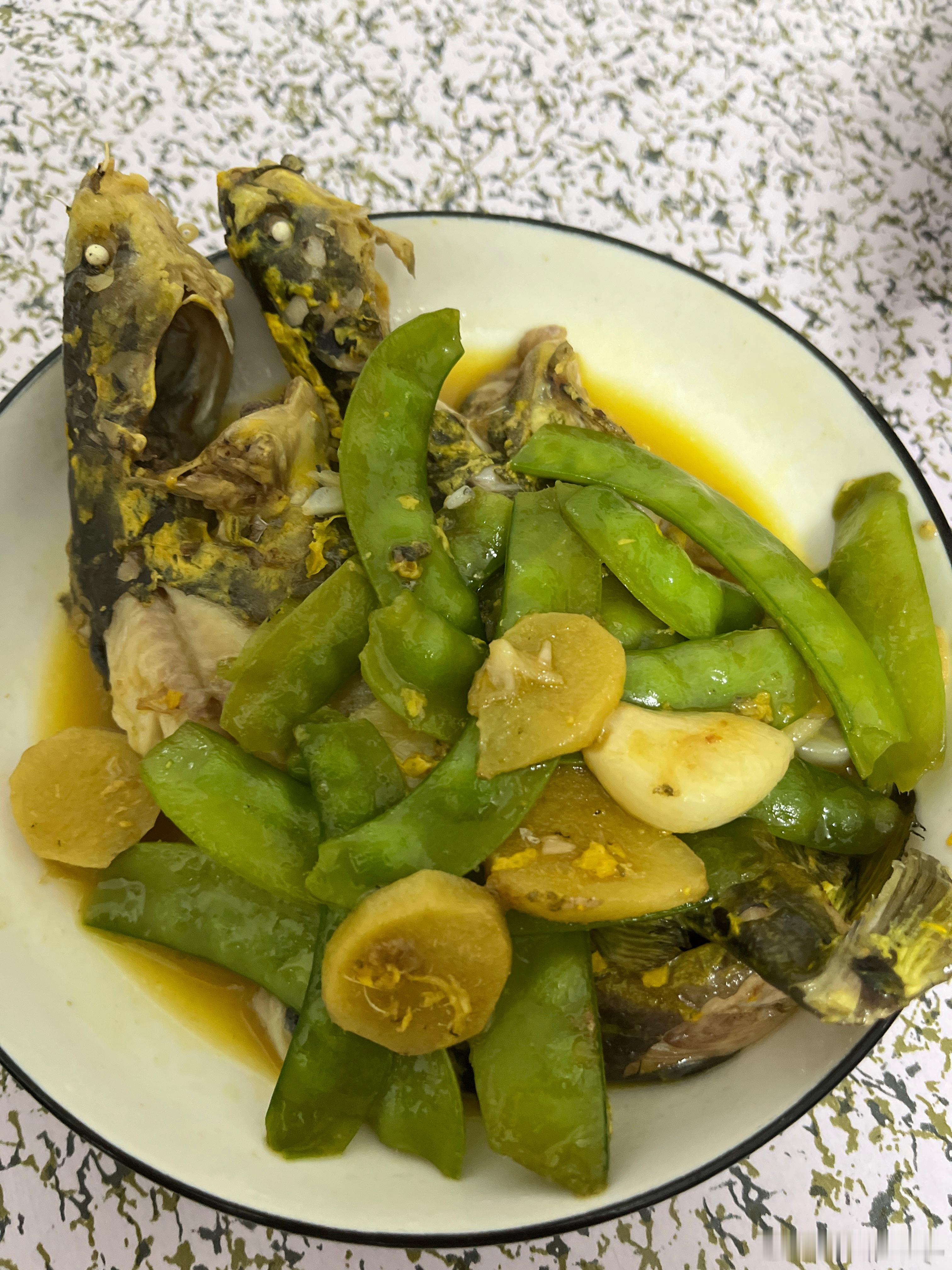 晚饭吃黄骨鱼,中午炒得荷兰豆,给她留了一些。她说不喜欢吃,我吃了一个,表演给她看