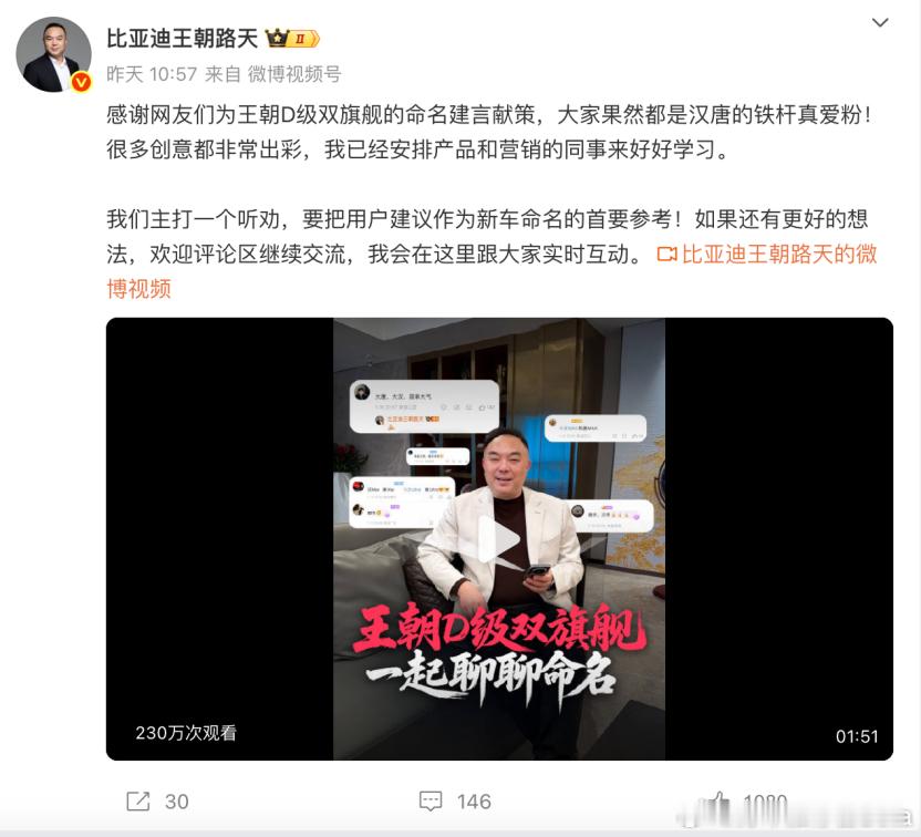 比亚迪汉唐9系命名权交用户,实车上半年亮相。日前,比亚迪王朝网销事业部总经理路天在网络上透露,关于汉9系和唐9系的命名将把用户建议作为首要参考。此外,这两款新车还将会在外观、内饰和技术上都很“顶”,实车也将会在今年上半年正式亮相。对于比亚迪来说,王朝系列几乎是出一款爆一款,主打的就是卷,不知道这次的旗舰款会不会把整个“9家族”的价格打下来?咱们拭目以待。比亚迪王朝