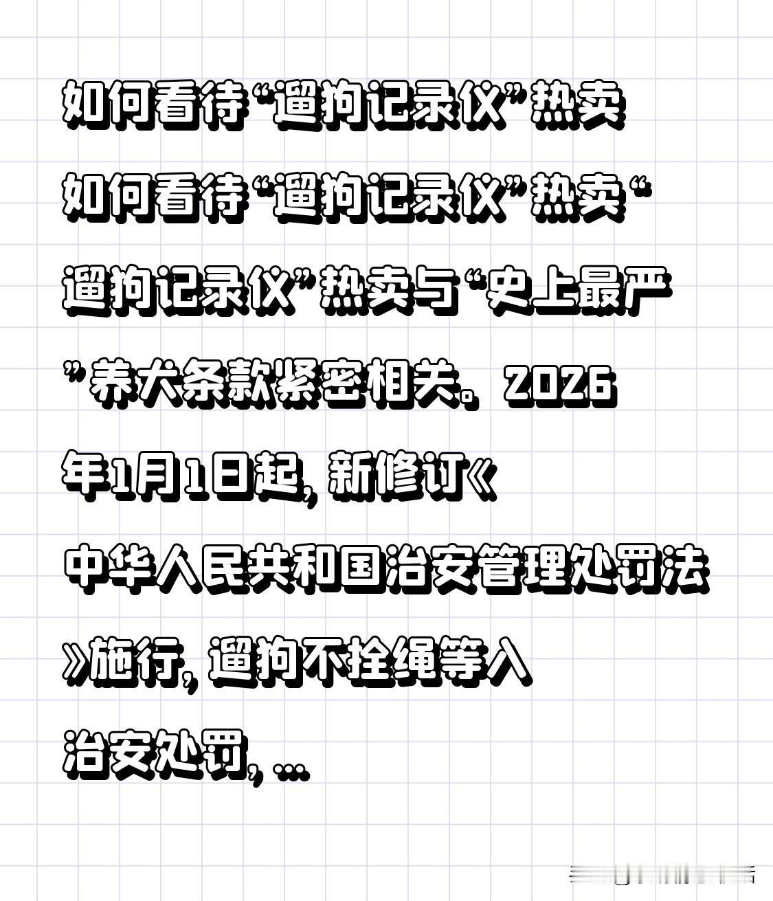 如何看待“遛狗记录仪”热卖 如何看待“遛狗记录仪”热卖 “遛狗记录仪”热卖与“史上最严”养犬条款紧密相关。2026年1月1日起,新修订《中华人民共和国治安管理处罚法》施行,遛狗不拴绳等入治安处罚,致人伤害最高处10日拘留及1000元罚款。 上海曾处理遛狗不牵绳致动物伤人案,狗主狡辩仍被依法处罚。这使养犬人更守规范,“遛狗记录仪”应运而生,能完整记录遛狗过程、规避风险。此现象体现法律引导,反映社会对文明养犬的追求,助于人与宠物和谐、构筑友好社会。