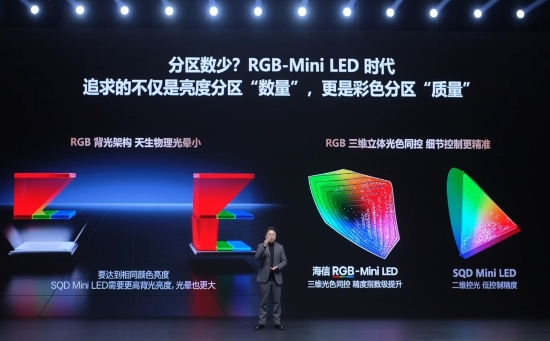 近年来,高端电视市场陷入单纯堆砌分区数量的内卷误区,一些厂商执着于分区数比拼,却忽视了光源、控光等显示技术的本质迭代。当前无论是qd-miniled还是sqd-miniled技术,本质都是单色背光+量子点miniled方案,依赖蓝光+量子点膜完成色彩转换,光线需经过量子点膜、滤光片等多重介质,不仅光能量损耗多造成功耗较rgb-miniled高出50%,同时高亮场景下更易出现色彩冲淡、画面泛白等问题,直接影响视觉体验。