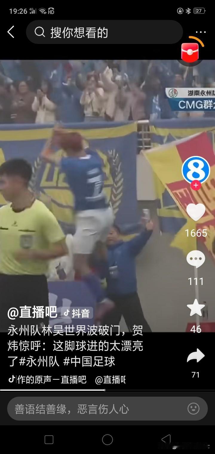 林昊在CMG的一脚世界波入选为央视体育频道《天下足球》的“一周十佳球”! 1月18日下午,林昊在CMG群众足球邀请赛的湖南永州队对阵山东泰安队中踢出的那记世界波进球,被1月19日央视体育频道的《天下足球》栏目选为“一周十佳”球!这是湘超永州队继去年张涛的倒挂金钩入选《天下足球》一周十佳球之后第二次入选《天下足球》一周十佳球了,更是去年湘超以来唯二的两个入选之球! 永州市因柳宗元的《捕蛇者说》而天下闻“恶名”,现在又因湘超永州队获冠又天下闻正名火爆全国,特别是中央广播电视总台1月18日到24日在永州市体育场举办的CMG群众足球邀请赛,邀请六个省超冠军队即湖南永州队、山东泰安队、广东湛江队、内蒙古呼和浩特队、黑龙江哈尔滨队、青海玉树队等六只超符队伍,齐聚永州,开展九场比赛,并且派出了三台直播车,九场比赛场场由央视体育频道全部直播,直接开创了全国群众足球由央视直播的历史! 1月18日下午湖南永州队和山东泰安队比赛,双方2:2握手言和;1月19日广东湛江队2:0战胜呼和浩特队。在永州队和泰安队的比赛中,泰安队的28号白云飞在开场4分多钟时,以一个漂亮的头球打开了永州队的球门,仅仅5分钟后,永州队的7号林昊以一个世界波的远射将比分扳平,并以该球入选央视1月19日《天下足球》的一周十佳球之列!至此,湘超永州队已经有两名球员的两个进球入选为《天下足球》的一周十佳足球,其中张涛的倒挂金钩还当选为2025年度全球百佳进球的第55名。 “这里是永州,我们是冠军!” 湘超成就了永州的草根逆袭故事,永州创造了湘超的永远冲锋神话,用一个又一个等同甚至超越职业球员的进球,迎来了泼天流量,得到了央视认可,促进了地方经济社会的正向发展!