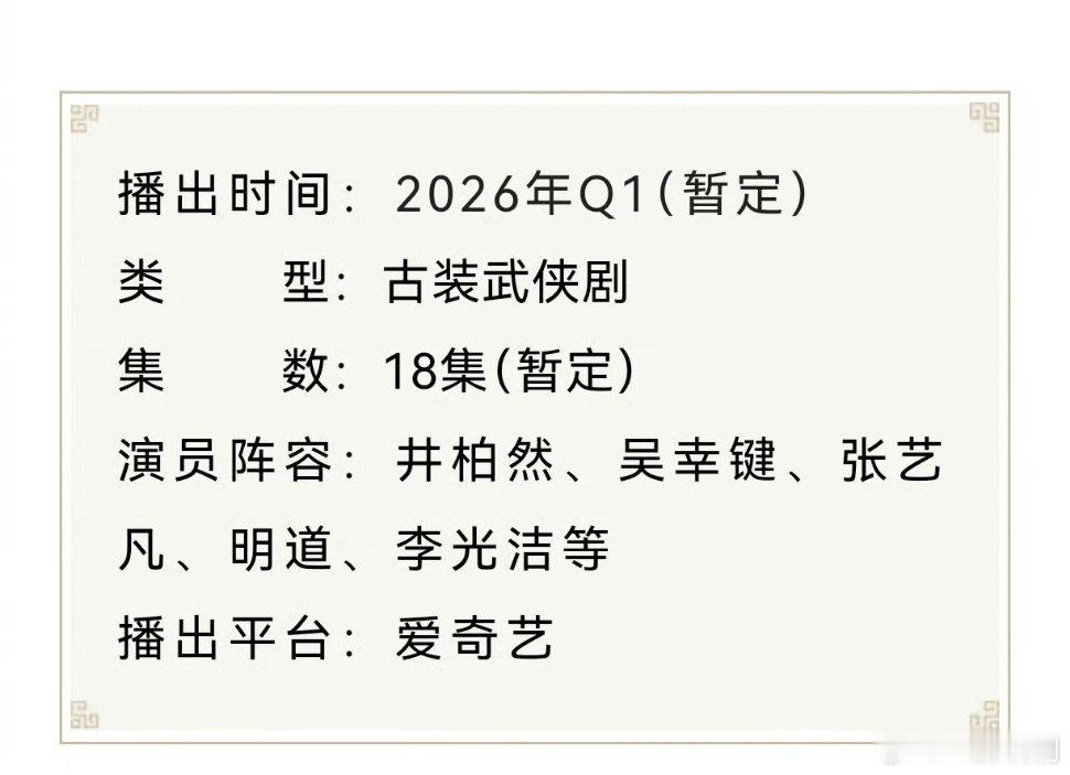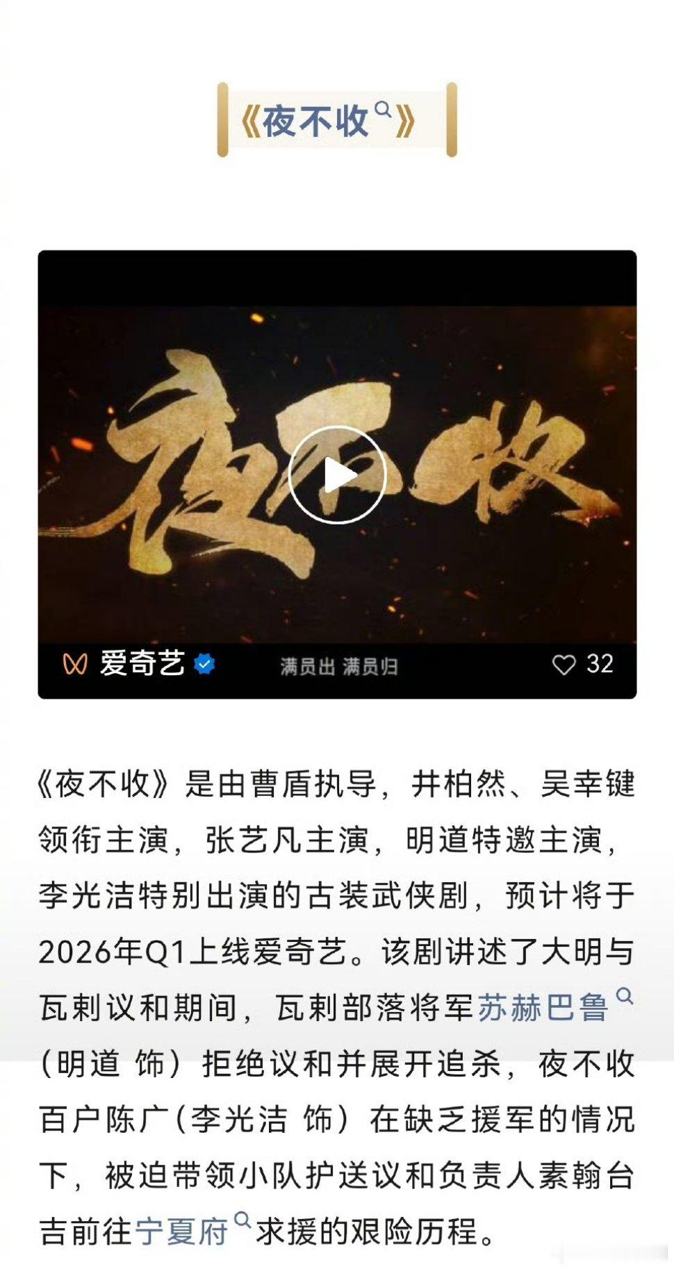 【二胖发布】夜不收开启招商 由曹盾执导,主演的古装武侠剧《夜不收》正式开始招商,Q1上线爱奇艺独家首播!
