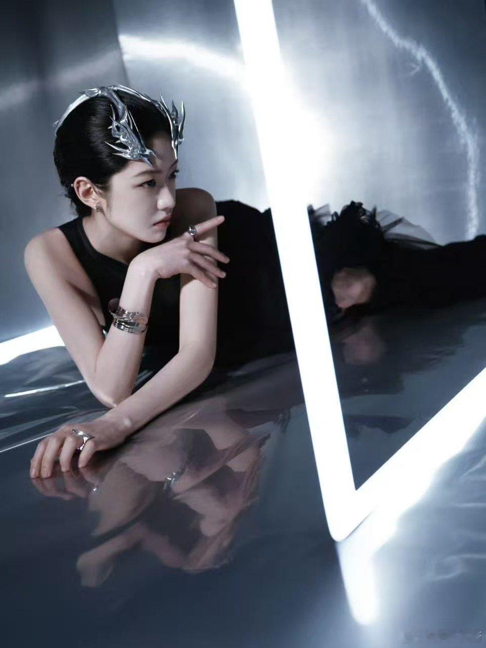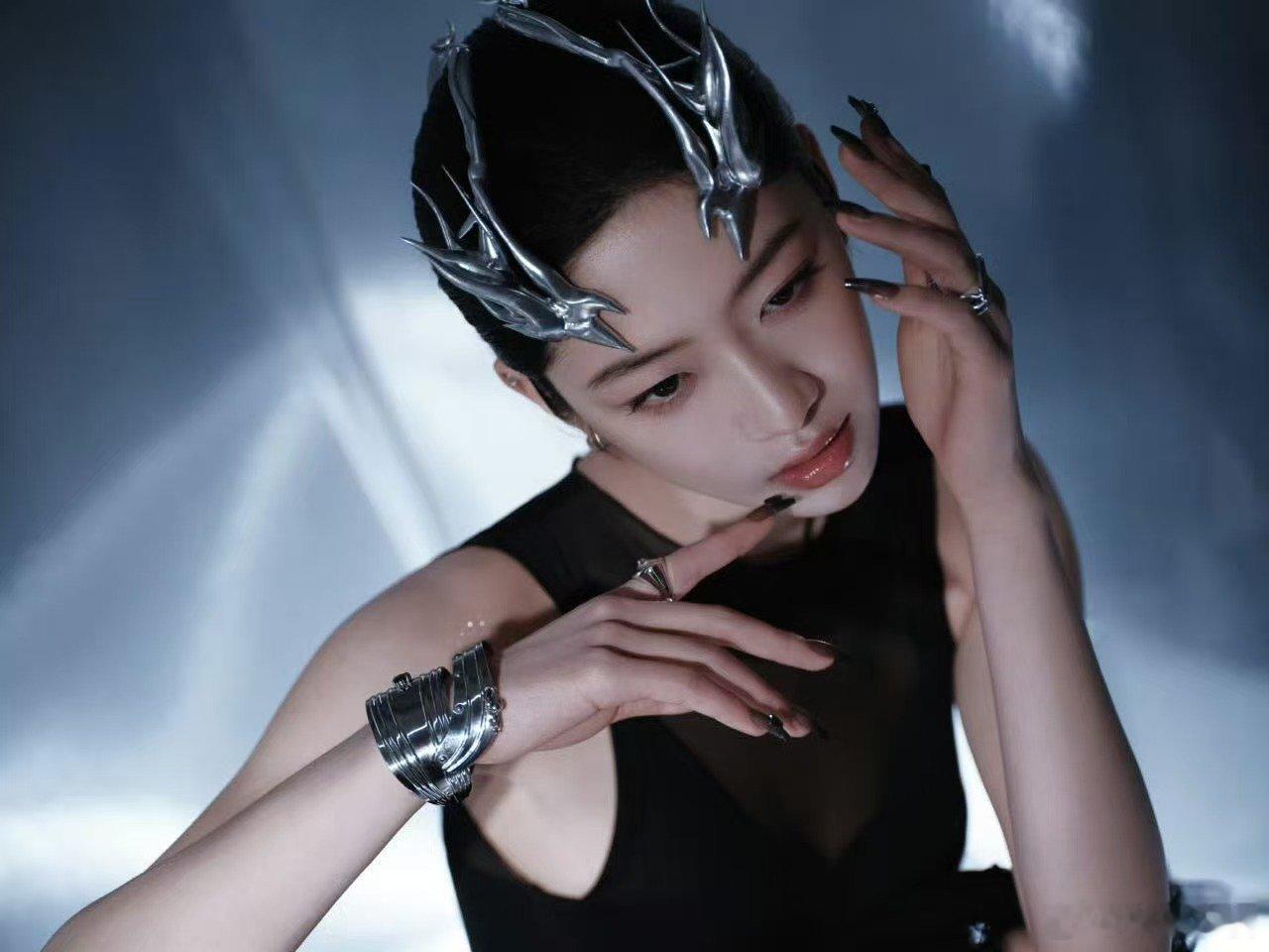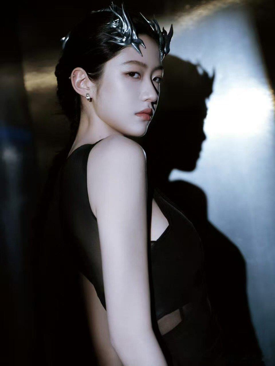 向涵之银角星冠刺破柔光,黑纱如夜流淌过锁骨,是暗夜精灵坠入凡间腕间金属缠绕成星河