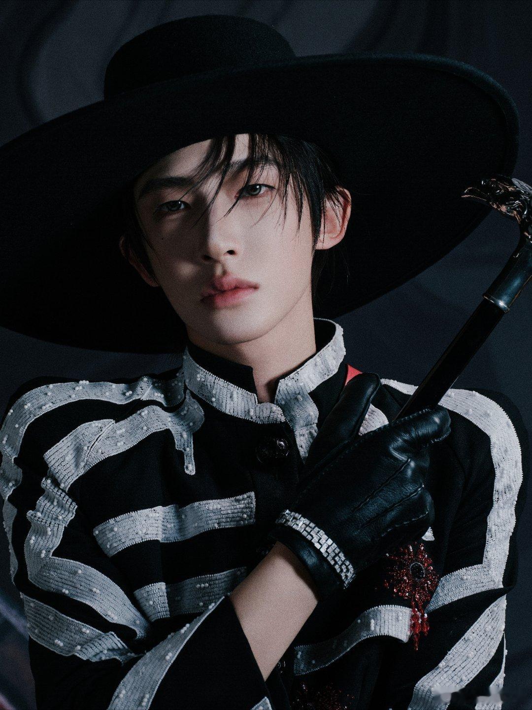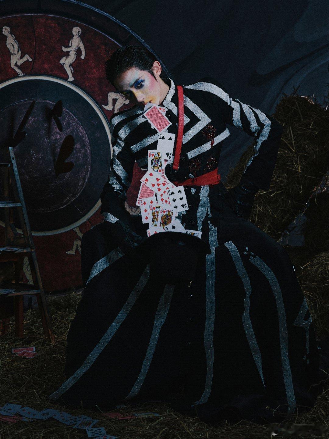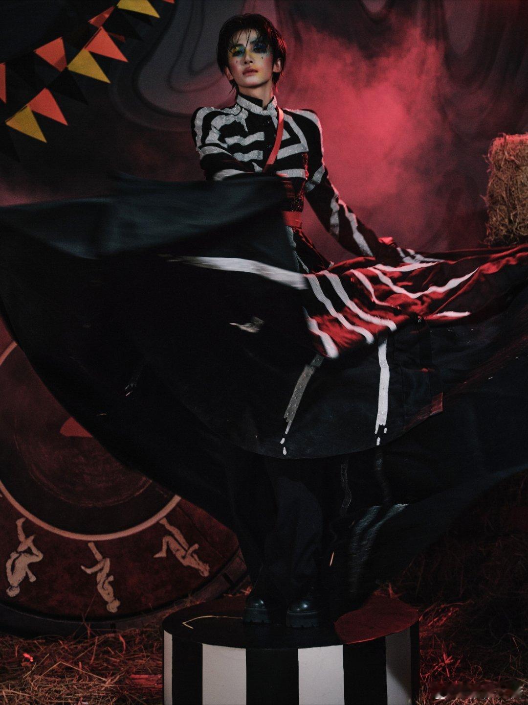 宽檐帽压着星子般的眼,黑白条纹在身畔织成流动的琴弦。红绸如焰缠绕骨感腰线,手杖轻点处,暗夜里绽开哥特式的诗。刘宇红毯马戏之王刘宇油彩妆魔术师高定Julien Fournié 2025春夏高级定制系列+萧邦高珠