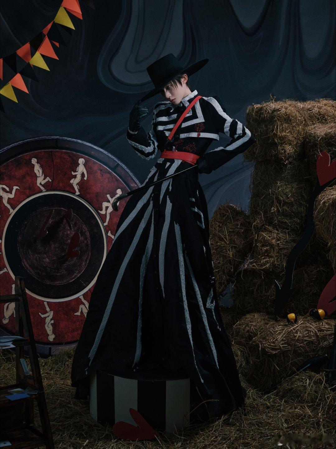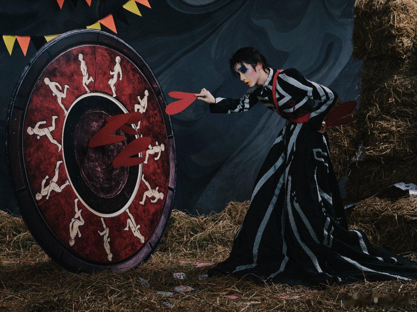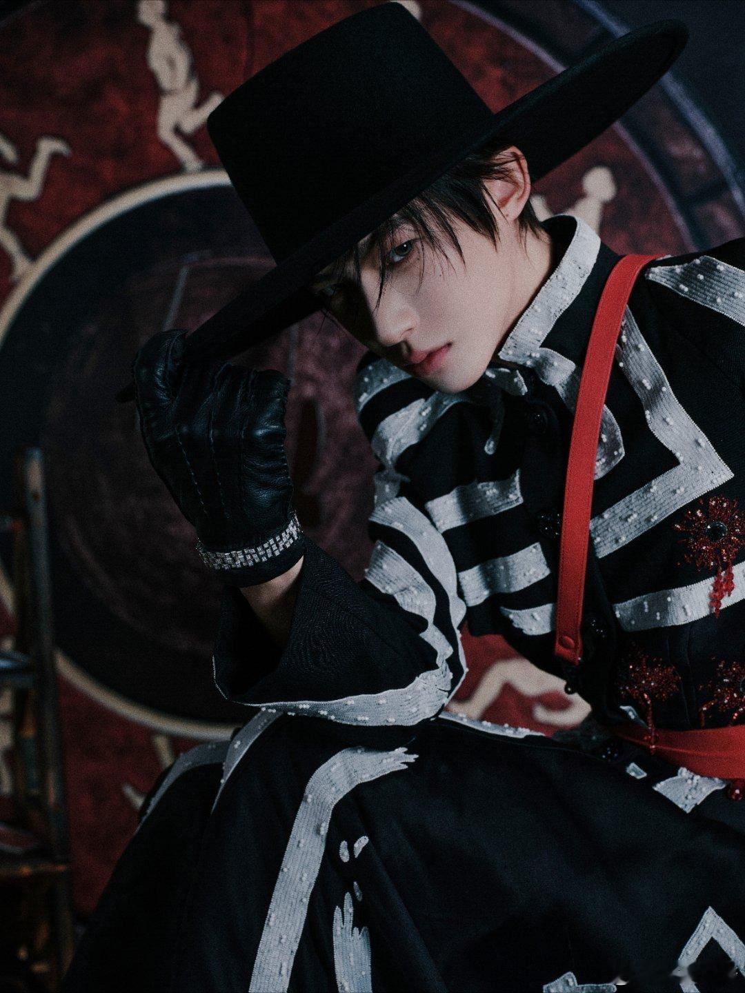 宽檐帽压着星子般的眼,黑白条纹在身畔织成流动的琴弦。红绸如焰缠绕骨感腰线,手杖轻点处,暗夜里绽开哥特式的诗。刘宇红毯马戏之王刘宇油彩妆魔术师高定Julien Fournié 2025春夏高级定制系列+萧邦高珠