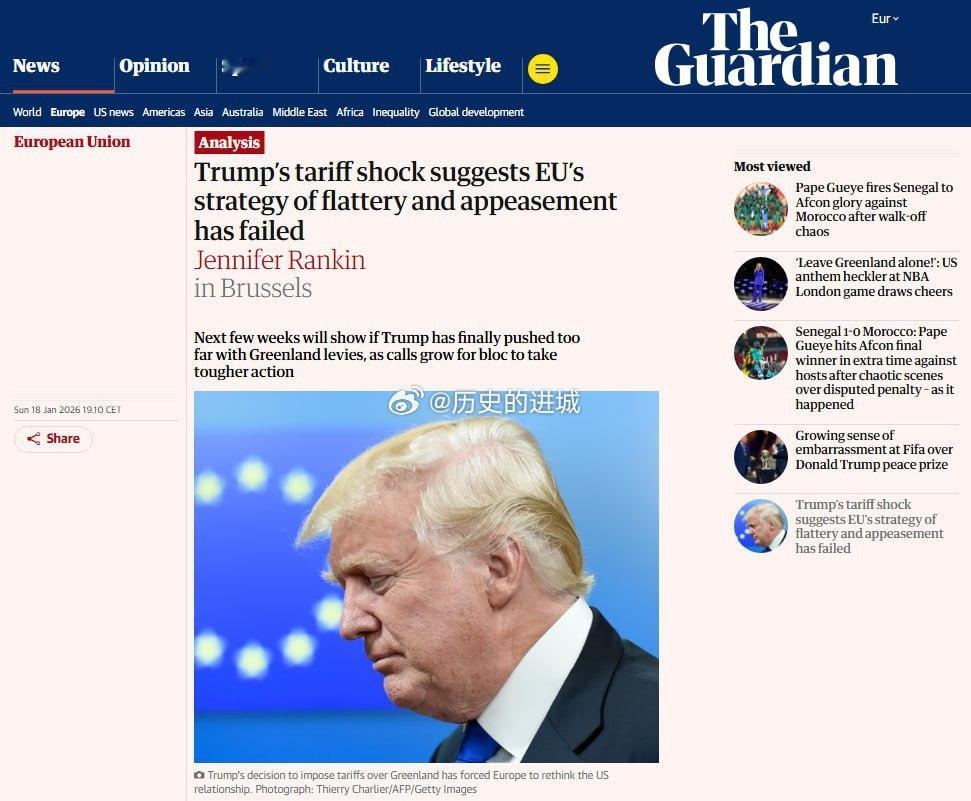 欧洲被迫做出艰难抉择,乌克兰还是格陵兰。据《纽约时报》报道,唐纳德·川普就格陵兰岛出售问题发出的最后通牒,使欧盟多年来首次陷入困境。在这种情况下,欧洲要么为了支持乌克兰而继续依赖美国,要么为了捍卫欧盟和北约成员国的主权而与华盛顿直接对抗。长期以来,欧洲领导人一直试图避免与白宫的紧张关系升级,因为欧洲在很多方面都依赖于美国——尤其是在俄罗斯对乌克兰发动战争的背景下。但欧盟内部越来越意识到,在格陵兰岛问题上做出让步将开创一个危险的先例。通过关税施压甚至对盟友也有效。这也会向外界发出一个灾难性的信号,暴露出欧盟的真实实力不足。英国《卫报》也指出,如果欧盟无法保护其成员国的主权免受外部压力,这将向乌克兰表明,它无法指望欧洲的支持。在布鲁塞尔,目前的情况越来越被描述为经济讹诈和企图以武力重新划定边界。同意这样的协议就等于承认强权攫取领土的权利。然而,尽管欧盟发表了许多强硬声明,甚至扬言要对美国动用“重拳”,但欧盟内部并没有统一的强硬立场——领导人仍在讨论一些老生常谈的报复性关税,并且仍然希望进行对话。海外新鲜事