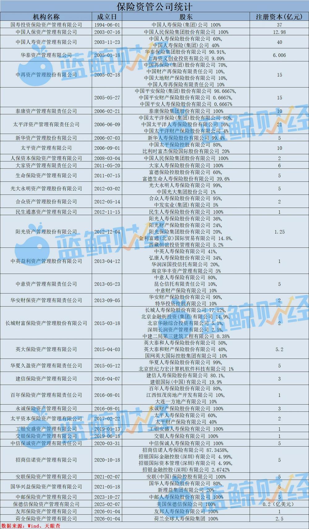去年12月31日,上海金融监管局批复同意友邦保险资管、荷全保险资管开业。这两家保险资管公司均为外资全资控股。其中,友邦保险资管注册资本1亿元,由友邦人寿100%控股,荷全保险资管的注册资本为2.5亿元,由荷兰全球人寿保险集团100%控股。