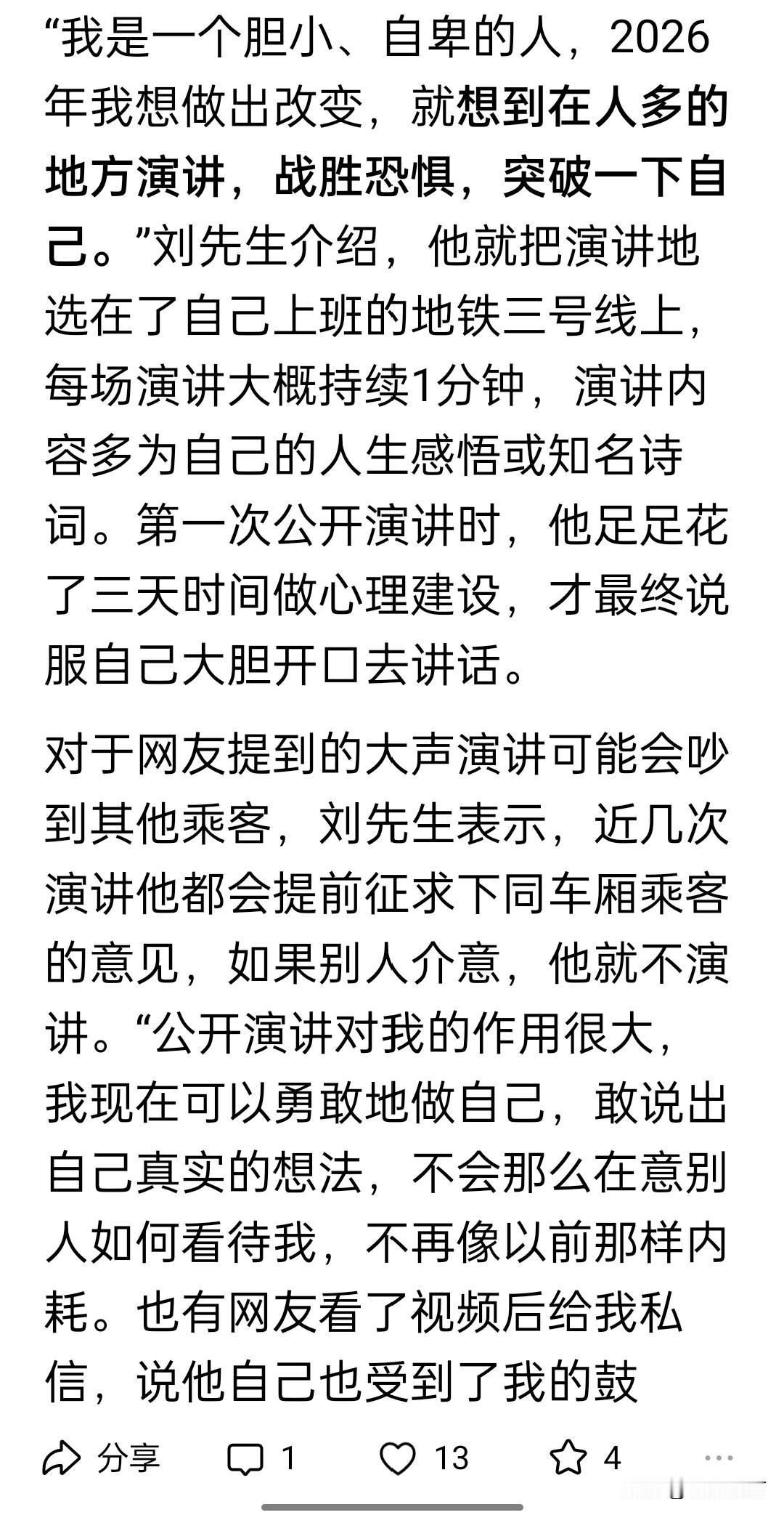近日广州一男子每天在地铁上坚持高声演讲,以克服自己的胆小、自卑的性格,有不少网友在线上线下为他打气。但是广州地铁回应称此举涉嫌违反乘客守则,甚至可能引起乘客不必要的恐慌。 地铁官方谨小慎微怕惹麻烦可以理解,但是男子称每次演讲前都会征得同乘的同意,所以也没必要因为极小可能的麻烦而禁止陌生人之间温情的互动。 刚巧看到媒体因为各地“杀猪宴”被叫停而呼唤弹性治理,我深表赞同,让情绪有序正面的释放肯定要好过内在奔涌,合理的疏导应该要优于四处防堵。[作揖]