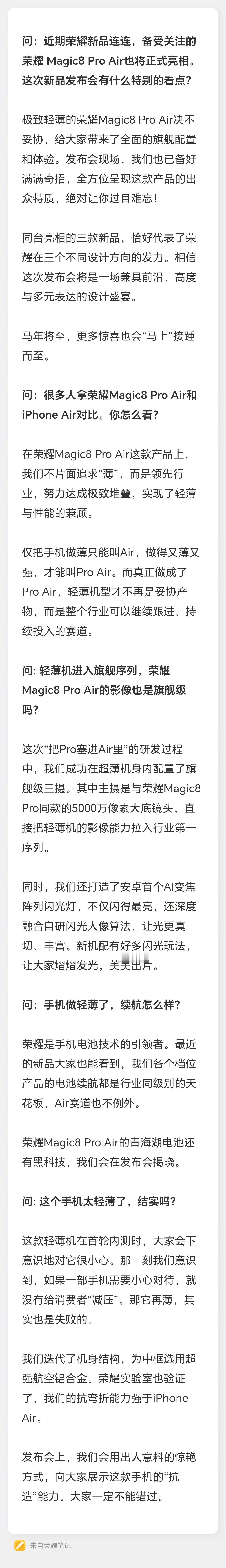 Air手机界来了个真Pro在轻薄机型的设计中,平衡各类硬件规格的矛盾始终是工程难点。荣耀Magic8 Pro Air的发布,展示了其在散热、电池体积与影像模组厚度之间取得的技术平衡。仅155克的整机重量,搭载Pro 级高规格配置,其实际量产机的内部结构设计,或将成为业内研究轻薄旗舰可行性方案的一个引领案例。荣耀发布会