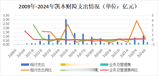 从凯本财险支出端来看,赔付支出因几次重大赔付案件出现峰值,导致该指标波动明显,2015年为历史最高3.07亿元。2024年为1.16亿元。此外,2025年该公司还支付了一笔0.525亿元的重大赔付,该年度赔付支出也将保持在较高水平。