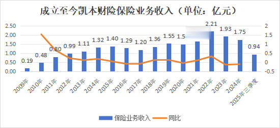 相比于总资产,该公司净资产则稳定得多,除了2010年、2011年略有减少外,其余年度均处于缓慢上升状态。2025年三季度,凯本财险净资产已升至3.30亿元,较2009年成立初期净资产1.99亿元增长65.83%。