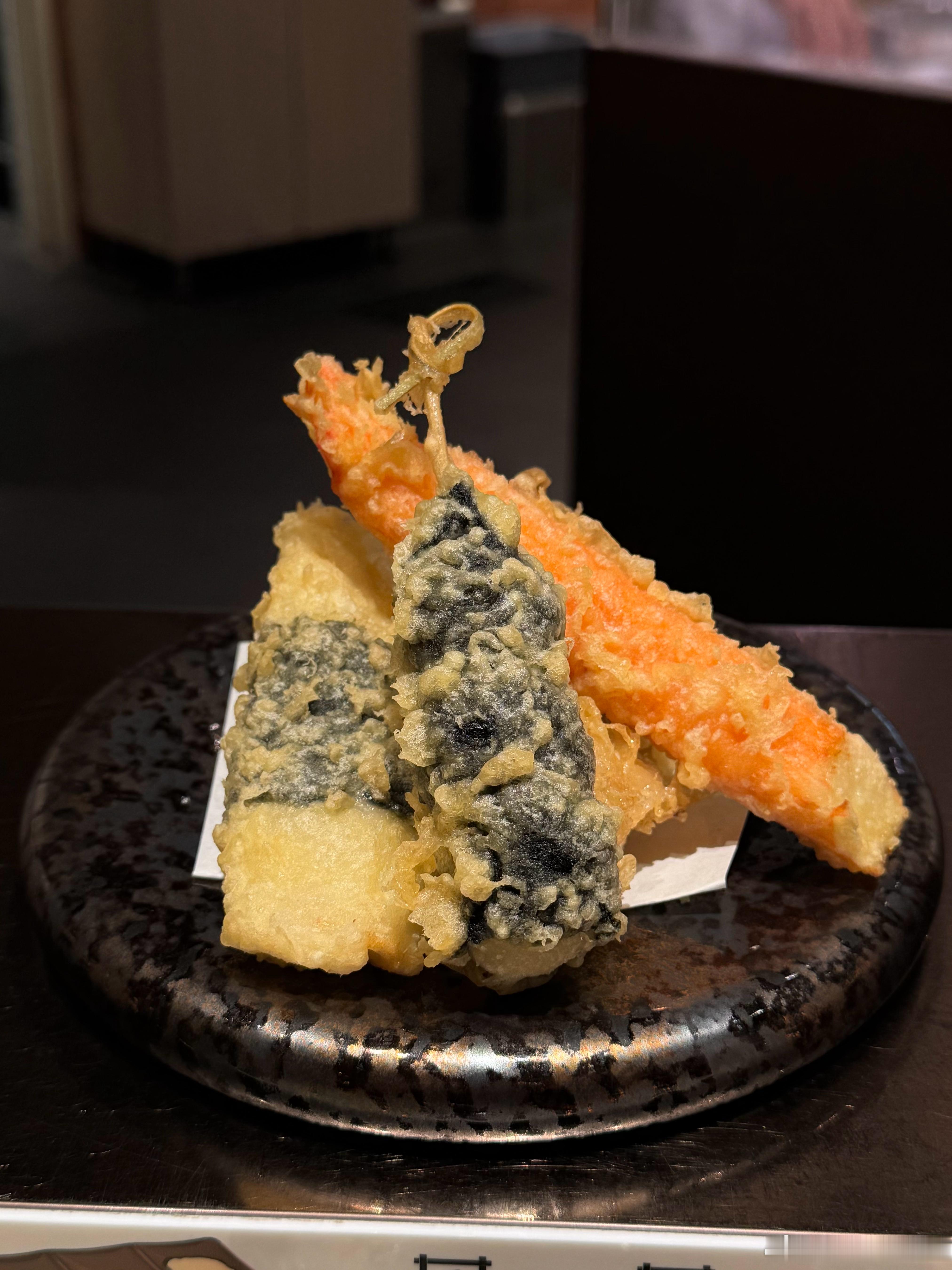 爱吃高端日料的群友都夸赞天天的天妇罗好吃,说不爱吃天妇罗的都会爱上。我倒要试试来整了个98的套餐,前五口赞叹不绝,吃到后面还是太腻了要yue出来了,狂喝三杯抹茶明厨现炸还翻台率极高,物语集团还是太厉害了不过我还是不理解小日子为什么爱吃炸物和生的(甜虾除外我可以炫一百只