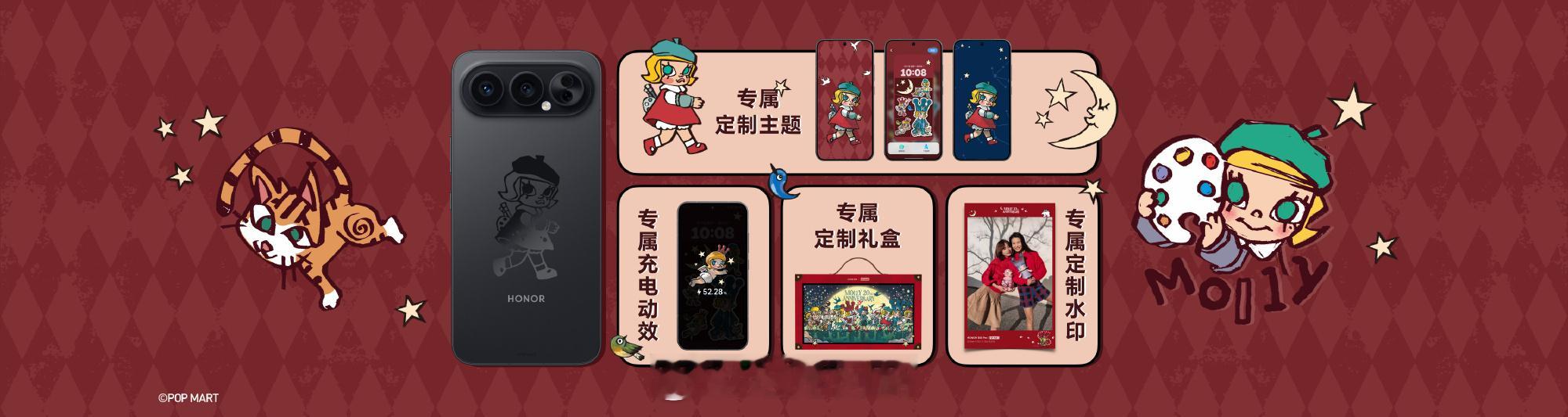 500 Pro MOLLY 20周年限定版为 3999,这个价格国补后我觉得还行?这次联名说实话挺好看的!超多限定版周边,火漆邀请函、MOLLY彩窗透卡、相机样式手机壳、定制卡针、手机挂以及胶片贴纸,尽享联名乐趣。临近春节,礼盒内更特别附赠年味十足的MOLLY定制红包与对联冰箱贴,这个春节,有MOLLY更有仪式感。荣耀500ProMOLLY限定礼盒