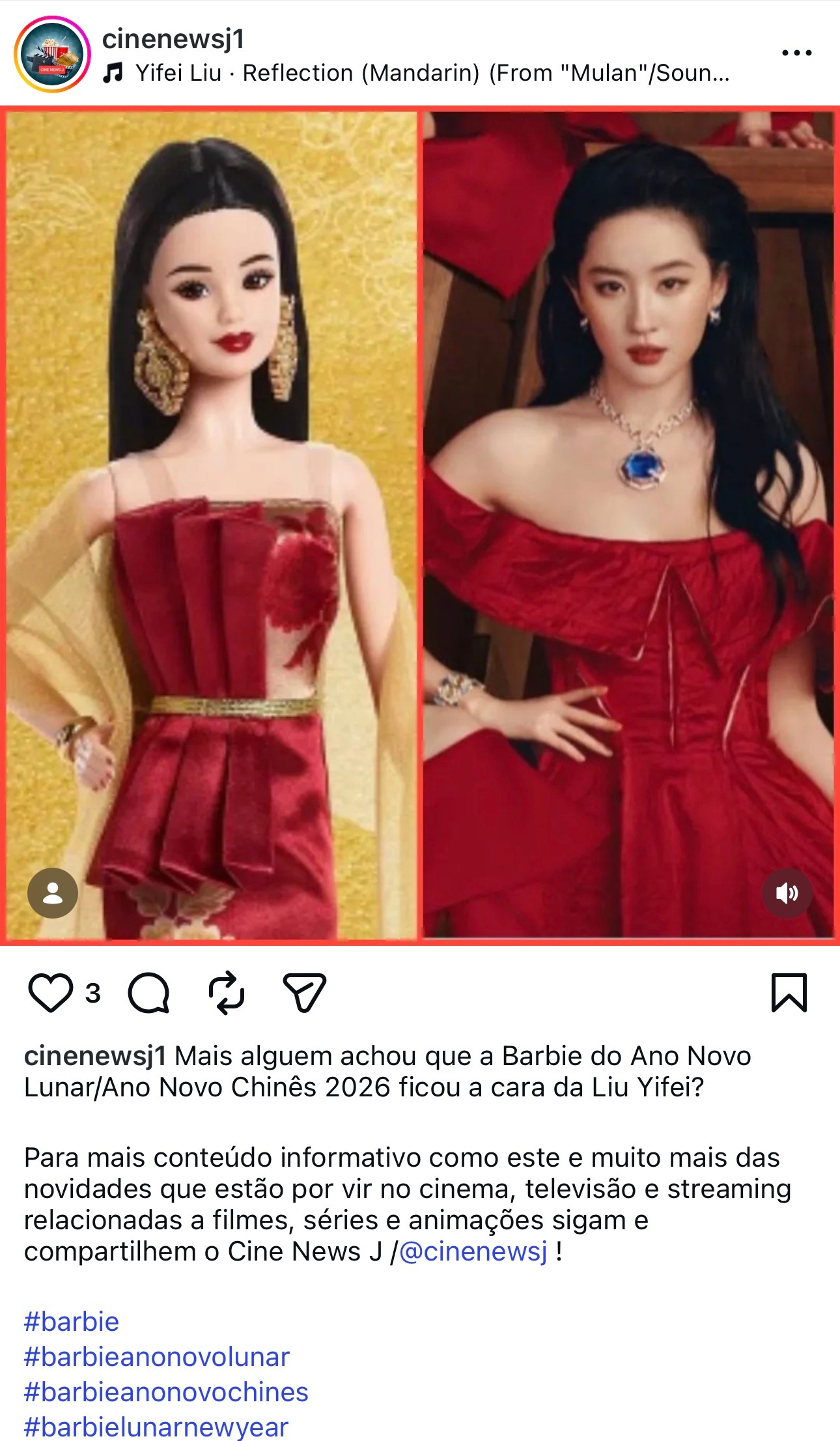 刘亦菲 lyf 花木兰 Mattel(芭比娃娃的公司)和迪士尼一直是有合作迪士尼公主Disney Princess Doll系列的,花木兰上映的时候刘亦菲真人版花木兰玩偶也很畅销,这位来自巴西的网友盘点的时候还指出今年Matte推出的农历新年芭比娃娃好似现代版的刘亦菲花木兰,我看翻译的大概意思是原po说这不就是刘亦菲的形象/脸么?甚至还拼了天仙Vogue金九二十周年佩戴宝格丽C位登封这张+使用了天仙演唱的《自己》作为bgm,刘亦菲和其饰演的花木兰确实都是最有影响力的东方女性面孔和角色,Iconic Face如是刘亦菲宝格丽全球品牌代言人