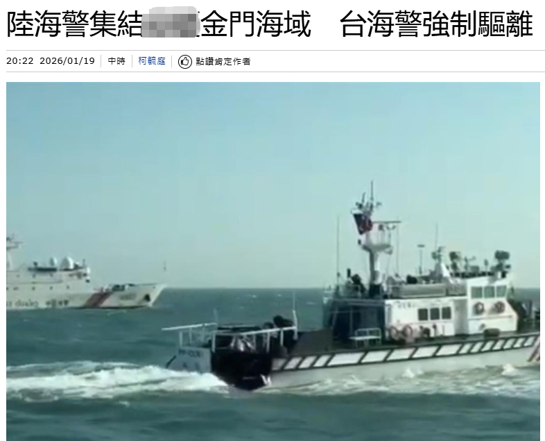事发地:19日金门海域,台“海巡署”扬言:强势驱离大陆海警。看了一下中时电子报内文,大陆海警4艘海警船今日14时许在金门海域进行巡逻,快17时许才离开。明明是“海巡署”的破小艇,心虚又有点气急败坏,被遛了3个小时。