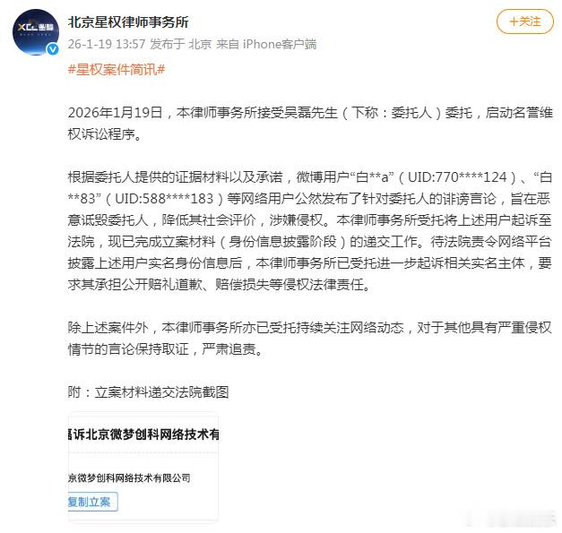 吴磊 不认识吴磊方依法追责造谣者 1月19日,发文回应白珊珊喊话“吴磊你欠我的拿什么还”:“不认识,已委托律师依法追责。” 随后,转发并评论:“吴磊先生与该博主素不相识,无任何交集!”还称将依法维权到底。同时称已接受委托,启动名誉维权诉讼程序。针对白珊珊发布的诽谤言论,已完成立案材料的递交工作,要求其承担公开赔礼道歉、赔偿损失等侵权法律责任。