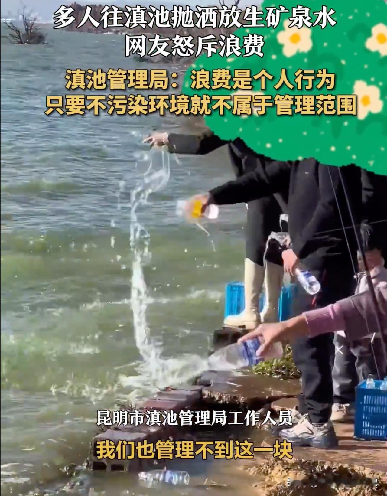 在水库放生猫、在水里放生大米、在大海放生淡水生物已经够魔幻了,这会儿又来一个在水里面放生矿泉水的,最近这段时间放生界怎么了?近日,在云南滇池就有多名男女往滇池里放生矿泉水,口中还念念有词疑似在念诵经文。这玩意儿虽然不污染环境,没人能管,除了有点儿浪费好像也没什么别的问题。但是,结合之前发生的放生大米等迷惑行为,这背后是不是有一股神秘的歪理邪说在支撑?因为,这些放生明显不是传统的放生行为,显得更加不理智,没有科学依据,是不是显得不对劲?强烈建议国家对这些行为背后的原因进行深度挖掘,看看是不是有什么新的神秘力量在作祟,毕竟这些做法既不符合传统信仰也违法科学常识!