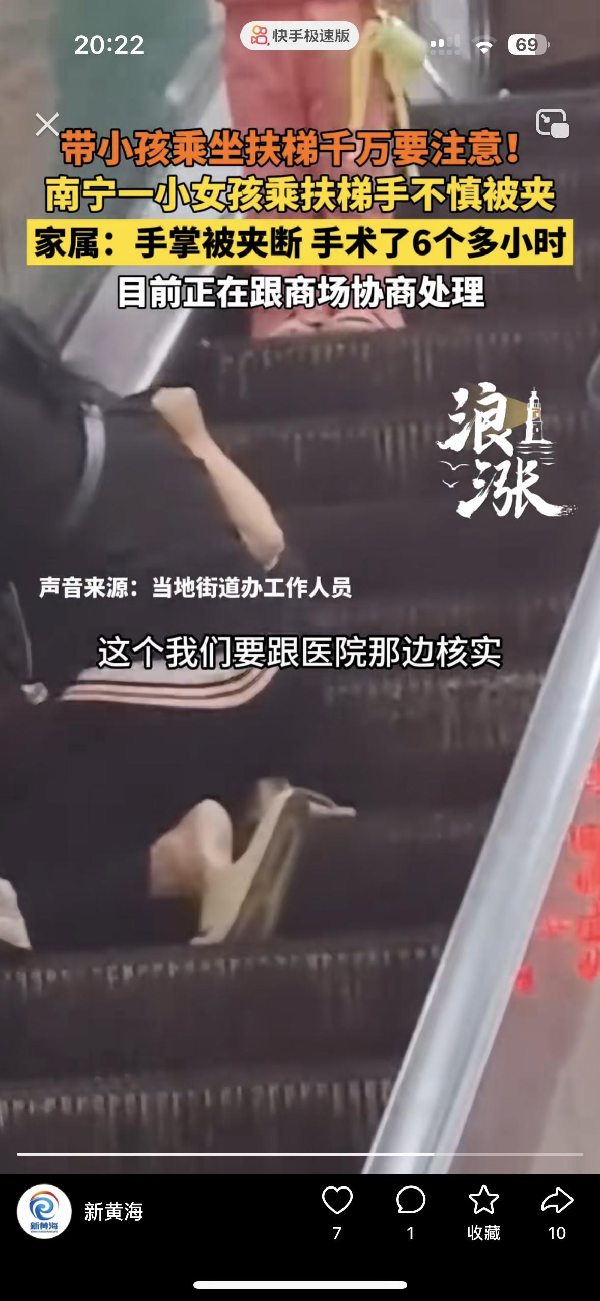 昨天在广西南宁,奶奶带着3个小孩去市场买东西。前面的孩子快走了一步上电梯,后面的孩子慢一步,奶奶就想着牵后面那个孩子跟上,没想到前面的孩子看到电梯下了2.3步,她感到害怕就蹲了下来 手不自觉伸进了扶梯,导致孩子的手掌被夹断 哭的那叫一个撕心裂肺,好在手术很成功,孩子奶奶很自责!3个小孩一起出门,自己顾不过来,造成这样的事情,真让人心疼