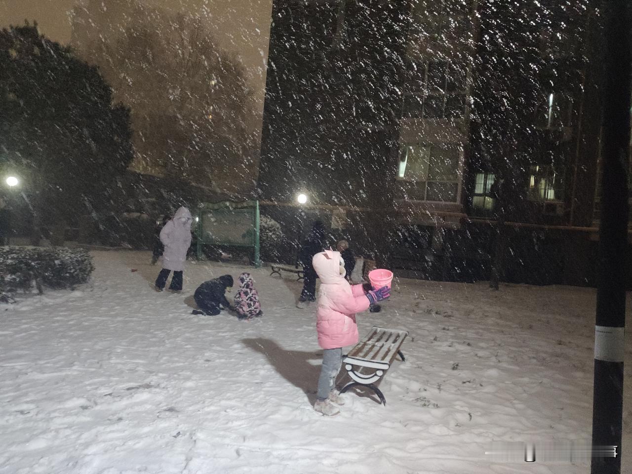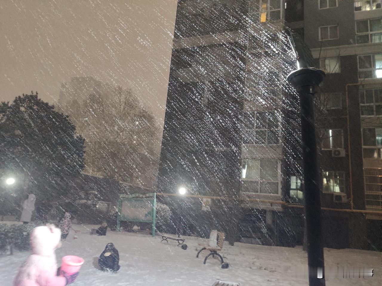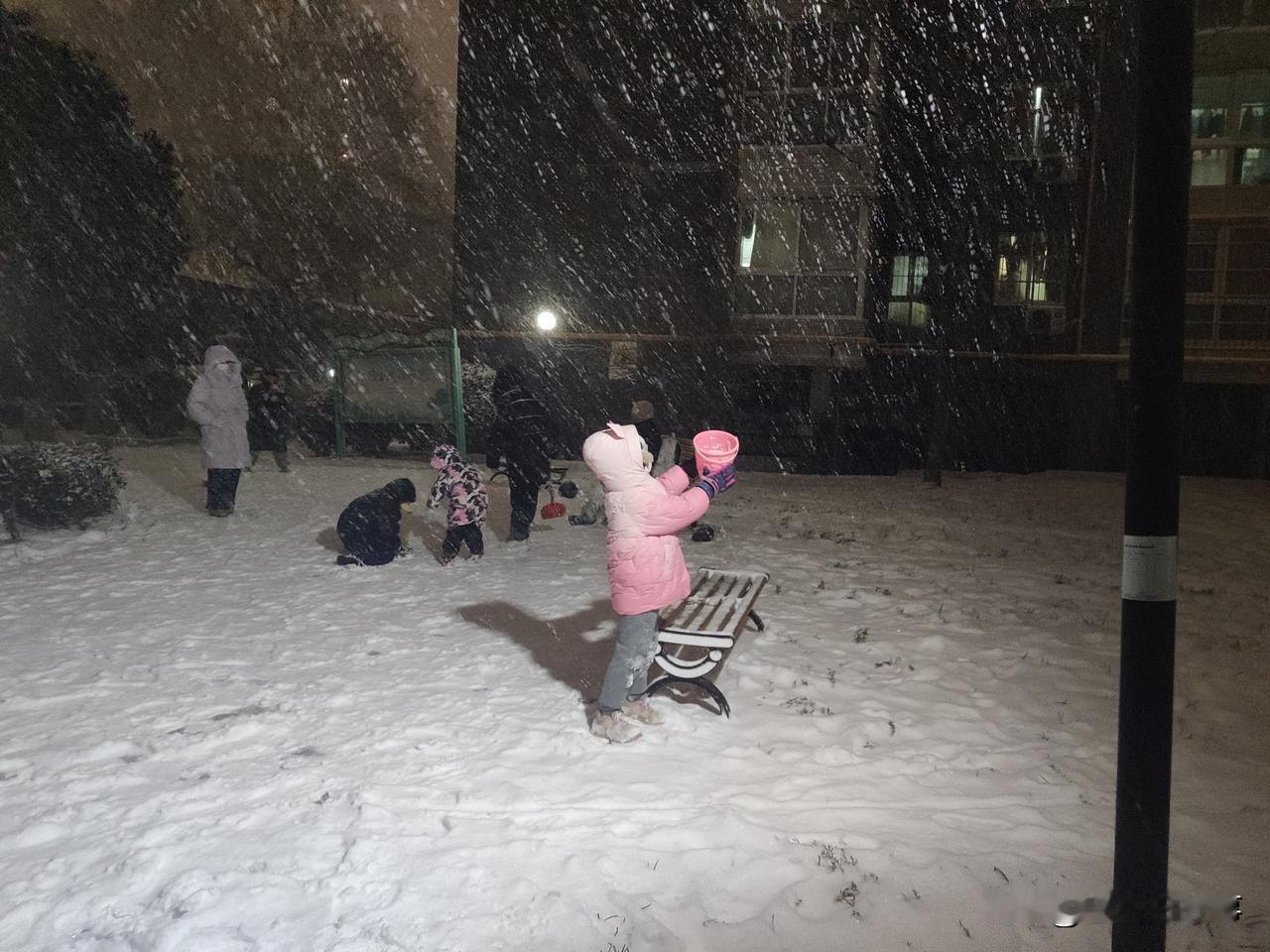 2026年的第一场雪,于元月19日晚上七点半左右开始变大,持续下到了九点左右逐渐变小,地上积雪可以没脚面。出来打雪仗、赏雪景、堆雪人儿的人很多。看,这小家伙(如下图)拿着一个玩具桶接从天而降的雪花。最稀少的是路上的车辆和行人,骑电动车的除了不辞辛苦的外卖小哥的身影之外,很难看到其他的人的身影。学校和幼儿园也相继发布通知,因天气原因,明天继续停课、闭园一天。