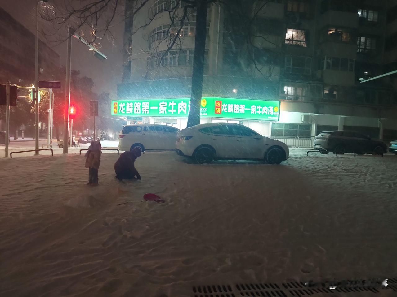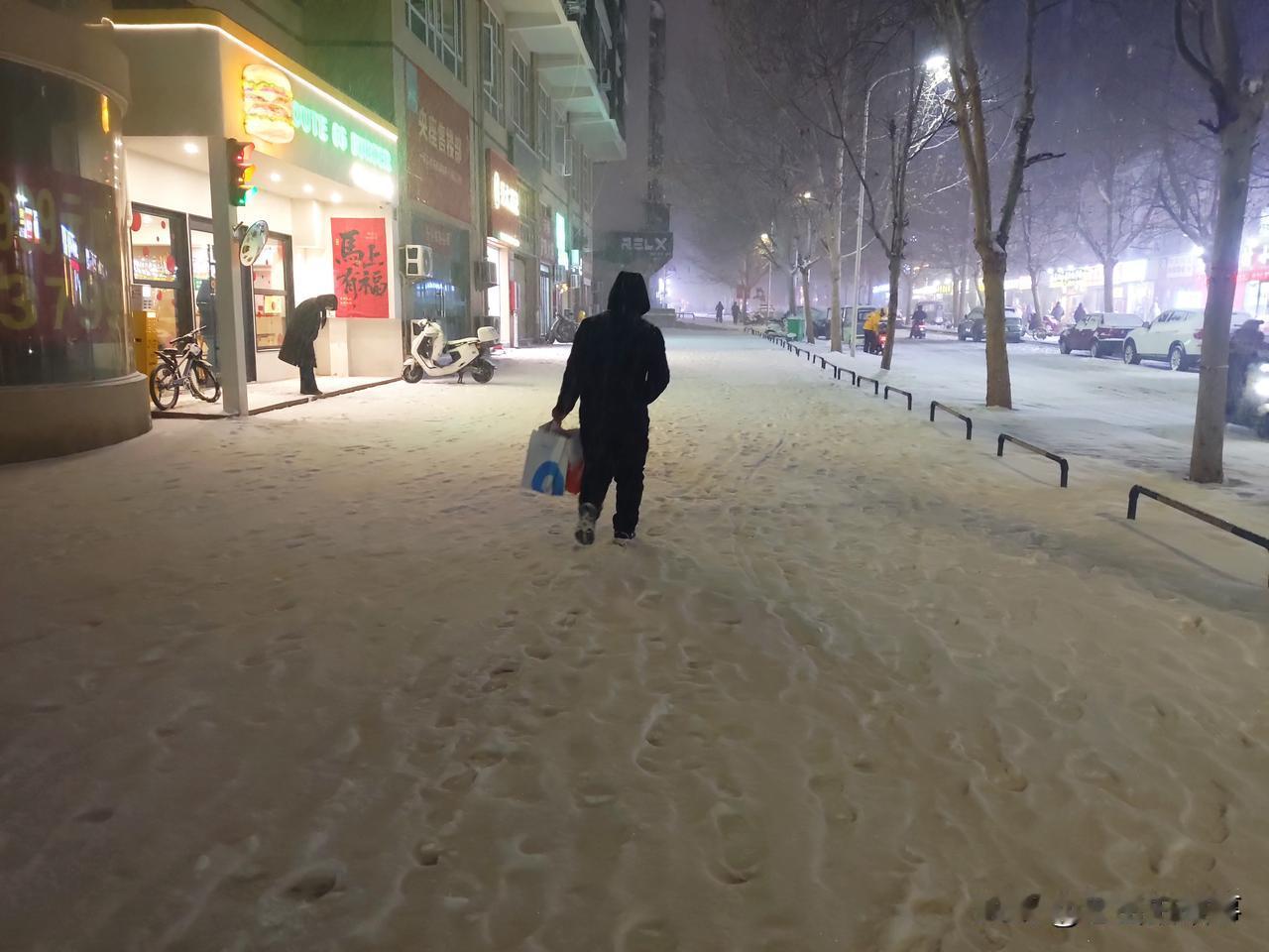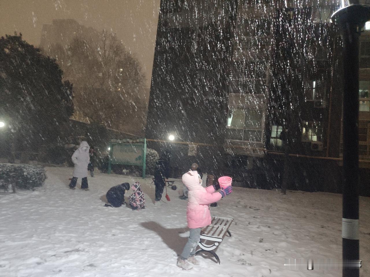 2026年的第一场雪,于元月19日晚上七点半左右开始变大,持续下到了九点左右逐渐变小,地上积雪可以没脚面。出来打雪仗、赏雪景、堆雪人儿的人很多。看,这小家伙(如下图)拿着一个玩具桶接从天而降的雪花。最稀少的是路上的车辆和行人,骑电动车的除了不辞辛苦的外卖小哥的身影之外,很难看到其他的人的身影。学校和幼儿园也相继发布通知,因天气原因,明天继续停课、闭园一天。