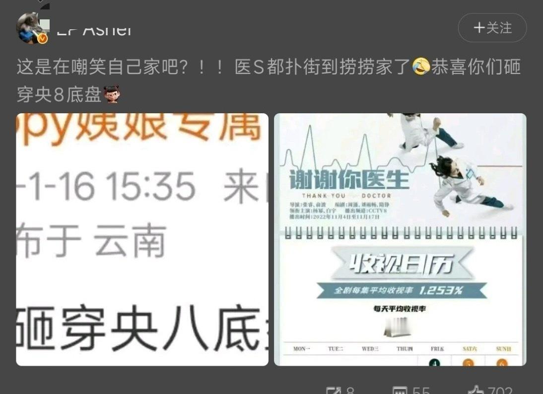 水城扑街了带我们小医生干嘛,当年《谢谢你医生》接档的《新居之约》集均才0.8的超低底盘,谢谢你医生收视率是近十年医疗剧第一,直接把当月大盘翻倍拉伸到1.253集均收视一路上涨,没有横盘没有下跌,有人自家剧连着扑街就打时间差黑别人,自家砸穿央八底盘气急败坏了