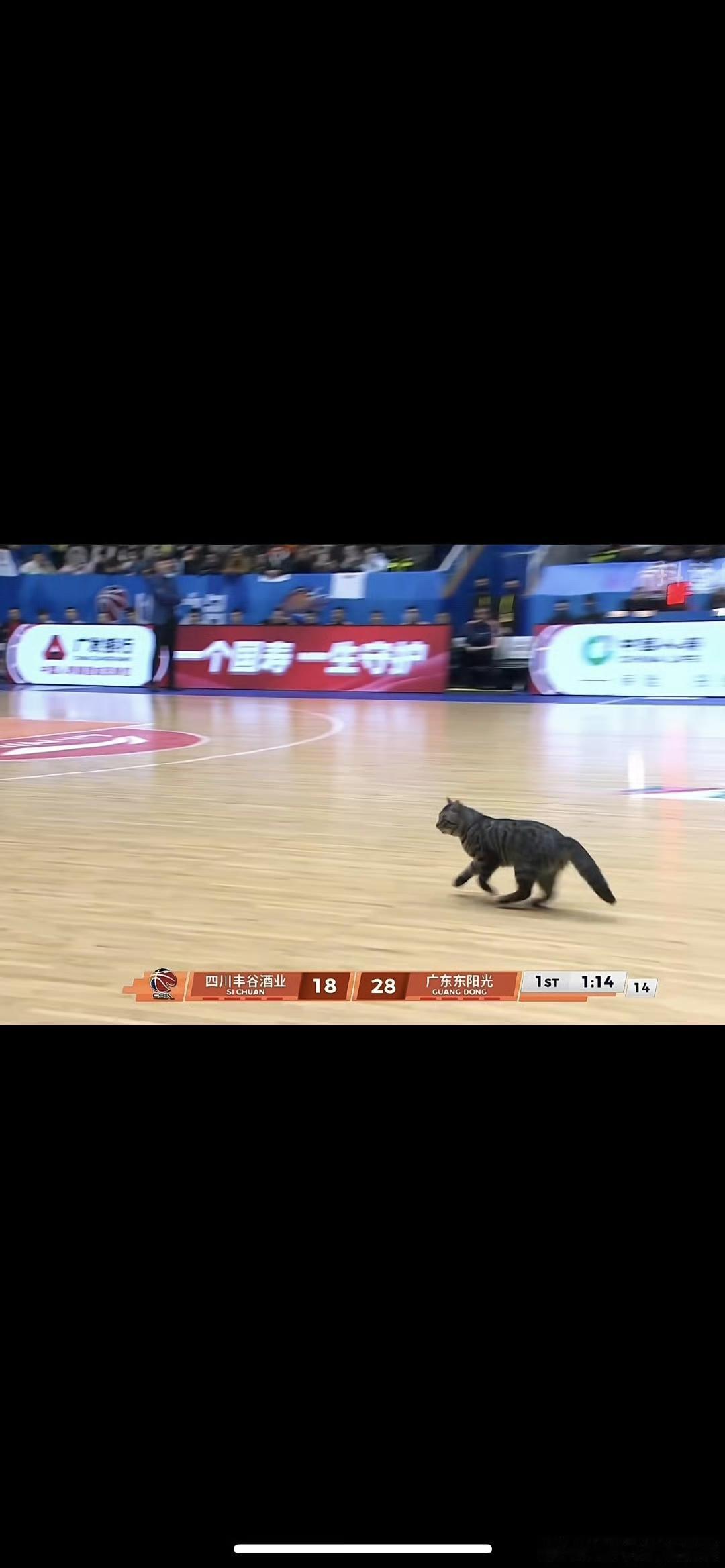 1月19日晚,CBA常规赛,广东队客场挑战四川队。上半场结束,广东队以52∶39暂时领先。 半场数据方面,胡明轩命中3记三分,拿下11分3篮板2助攻;徐杰得到7分;奎因贡献16分5篮板5抢断;萨林杰拿到13分6篮板。 上半场比赛波澜不惊,球迷们也显得颇为安静。直至一只狸花猫闯入球场,现场气氛瞬间热闹起来。靠猫咪来带动气氛,广东队着实该反思,为何上半场表现不佳。