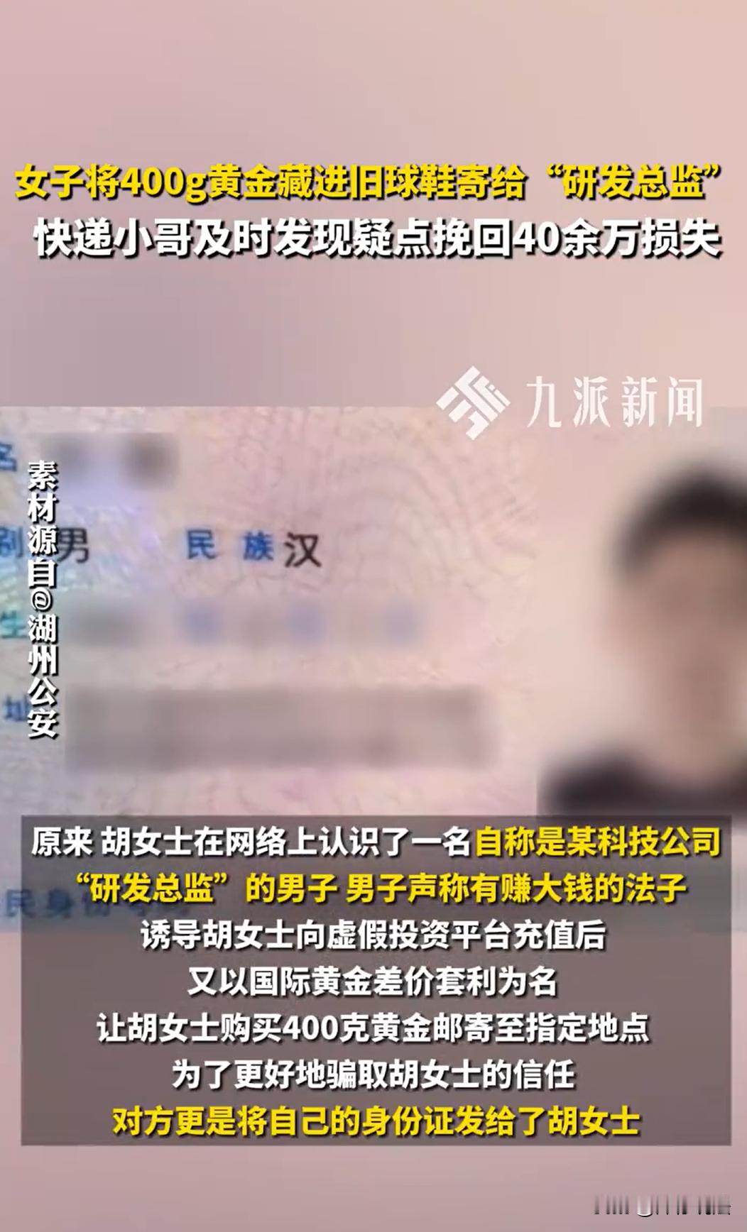 浙江湖州,一女子在快递点寄旧鞋时,快递小哥一掂量,发现鞋子沉得不寻常,伸手一摸,竟从鞋垫下掏出了用报纸裹着的两块金条,足足400克!面对追问,女子神情躲闪,只说帮朋友寄送。快递小哥怀疑这是新型骗局,果断报警。警方火速上门,女子起初还试图遮掩。随后,警方再次登门,女子才哭着坦白,称其在网上结识了一位温柔体贴的“科技公司总监”,对方先带她在虚假平台小额盈利,随后以“国际黄金套利”为诱饵,让她购买金条并邮寄到“指定地点”,还发来了伪造的身份证。在警方陪同下,她前往骗子提供的地址核实,发现根本查无此人,此刻,女子才意识到被骗,差点损失40余万元。   据悉,盛敏杰是某快递营业点里的快递员,干这行已有五年,多年的工作经验养成了一种职业敏感,尤其是在“开箱验视”这个环节上,从不马虎。   近日,盛敏杰接到一个寄件订单,寄件人是一位中年女子胡女士,她带着一个普通的纸箱来到网点,声称要寄一双“旧球鞋”。   盛敏杰微笑着打开箱子进行验视,箱子里确实是一双略显陈旧的白色运动鞋,但当他拿起鞋子掂量时,却觉得重量有些异样,鞋身沉甸甸的,不像普通鞋。   盛敏杰下意识地摸了摸鞋内,指尖触到一团硬物,抽出鞋垫,只见鞋膛里塞满了揉成团的报纸,扒开纸团,取出那硬物,发现两块长方形的金条,每块约200克,总重约400克。   盛敏杰抬头看向胡女士,问道:“这是黄金吧?您要把黄金寄给谁?”   胡女士的神色瞬间变得慌张,她支支吾吾地说:“是……是帮朋友带的,没什么。”   但她的眼神躲闪,手指不自觉地绞着衣角。   盛敏杰立刻意识到不对劲,想起最近派出所多次上门进行的反诈宣传,特别提到一类“邮寄黄金”诈骗。   眼前的胡女士,举止忐忑,寄送高价值物品却借口“旧鞋”,这些特征与民警描述的诈骗受害者高度吻合。   盛敏杰没有犹豫,当即对胡女士说:“抱歉,这个包裹我不能收,建议您再核实一下。”   同时,盛敏杰取消了寄件订单,并迅速汇报了情况,紧接着,拨通了报警电话。   警方接警后,火速赶往胡女士的住址,敲门时,胡女士仍有些抵触,但沈炜亮明身份,耐心说明来意:“我们是来帮助您的,避免您上当受骗。”   起初,胡女士仍坚持说是“帮朋友忙”,但在沈炜列举多个类似诈骗案例后,她的心理防线开始松动。她承诺暂时不会寄出黄金,但眼神中仍有一丝将信将疑。   随后,警方多次上门沟通,胡女士终于哽咽着道出了事情原委。   原谅,几个月前,胡女士在网络上认识了一位自称是某知名科技公司“研发总监”的男子王浩。   王浩谈吐优雅,声称掌握内部投资渠道,可以带胡女士“赚大钱”。   起初,胡女士并未轻信,但王浩每日嘘寒问暖,逐渐取得了她的信任,他分享所谓“成功案例”,展示虚假的盈利截图,并鼓励胡女士在一个他推荐的“投资平台”进行小额充值。   前期,平台确实返还了少量利润,让胡女士尝到了甜头。   随后,王浩抛出“重磅机会”,让胡女士购买400克黄金,并邮寄到“指定合作方”处,由对方操作套现,承诺三天内返还高额收益。   为打消胡女士疑虑,王浩甚至发来了自己的“身份证”照片,显示其为某地居民,照片清晰,信息完整。   胡女士被高回报冲昏了头脑,遂前往金店购买了400克黄金,价值约40余万元,按照王浩指示,将黄金藏在旧鞋中,试图以普通包裹寄出。   之后,警方陪同胡女士来到骗子声称的“租房地址”,经实地走访,该地址的屋主另有其人,且近期无租客符合“王浩”的身份信息。   所谓“身份证”经初步核验,系伪造证件。   站在陌生的公寓楼下,胡女士终于彻底醒悟,那个嘘寒问暖的“王浩”,从头到尾都是一场精心设计的骗局。   那么,从法律角度,这件事如何看待呢?   《刑法》 第二百六十六条规定,诈骗公私财物,……数额巨大或者有其他严重情节的,处三年以上十年以下有期徒刑,并处罚金……   本案中,王浩虚构了“科技公司研发总监”的身份,并使用伪造的身份证件,此系“虚构事实”。   其次,王浩以小额返利骗取胡女士初始信任后,编造“国际黄金差价套利”这一根本不存在的投资计划,诱使胡女士产生错误认识,此系“隐瞒真相”。   同时,王浩指使胡女士购买并邮寄黄金,目的在于非法占有该巨额财产,完成了“骗取财物”的行为指使。   此外,王浩从伪装身份、情感经营到设计复杂的“邮寄”环节均以最终取得并控制胡女士的黄金为核心目的,主观故意明显。   所以,王浩已经构成诈骗罪,结合浙江地区司法文件,诈骗金额达到40余万,达到数额巨大标准,依法应在3年至10年有期徒刑追究刑责。   不过,根据《刑法》第二十三条,王浩虽然实施了犯罪,但因快递员与警方介入此“意志以外原因”未能得逞,构成未遂,依法可以从轻或减轻处罚。   对此,您怎么看?