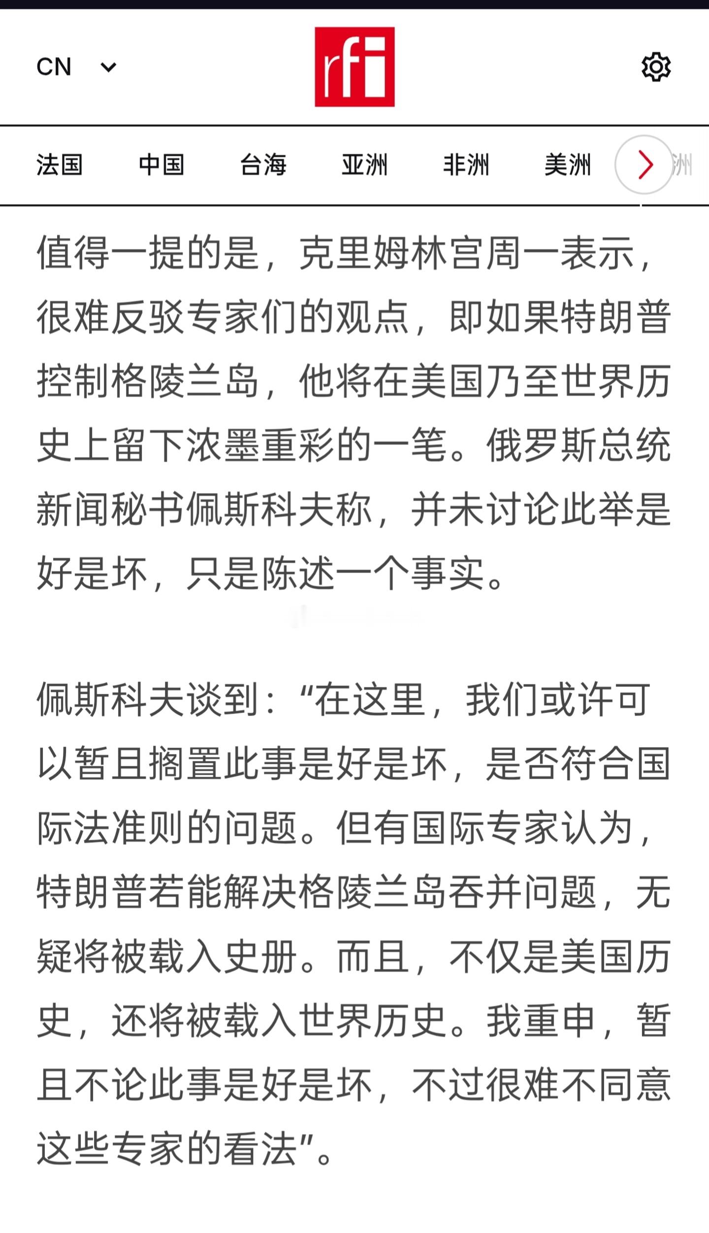英国首相斯塔默周一表示,盟友之间需要就格陵兰岛问题进行冷静的讨论,贸易战不符合任何一方的利益。此前美国总统特朗普威胁要对英国等盟国就格陵兰岛问题加征关税。值得一提的是,克里姆林宫周一表示,如果特朗普控制格陵兰岛,他将在美国乃至世界历史上留下浓墨重彩的一笔。俄罗斯总统新闻秘书佩斯科夫称,并未讨论此举是好是坏,只是陈述一个事实。佩斯科夫谈到:“在这里,我们或许可以暂且搁置此事是好是坏,是否符合国际法准则的问题。但有国际专家认为,特朗普若能解决格陵兰岛吞并问题,无疑将被载入史册。而且,不仅是美国历史,还将被载入世界历史。我重申,暂且不论此事是好是坏,不过很难不同意这些专家的看法”。 海外新鲜事