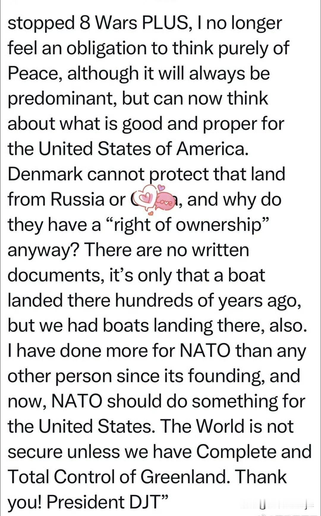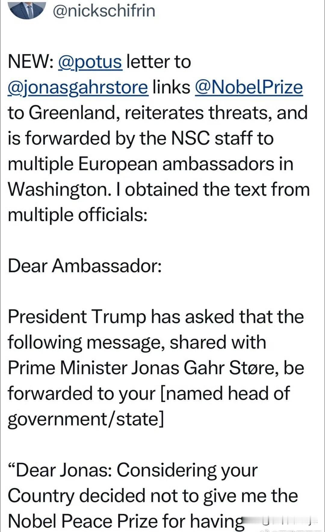 美国总统致信挪威首相:鉴于你们国家决定,虽然我阻止了八场战争,还是不给我和平奖,我不再只想着和平,我要想什么对美国有利…丹麦根本保护不了格陵兰,为什么有“所有权”…没正式文件,只是几百年前一艘船到过…我们的船也到过,而且我为北约做的贡献,超过成立以来所有人…现在,北约该为美国做些事了,只有我们完全控制格陵兰,世界才会安全。 美国总统已要求国安委,把信的内容抄送欧洲各国驻美使馆,让大使们都看看。 特朗普这段的言论,非常集中地展现了他第二任期一些备受争议的政策立场和外交思路。它将三个独立但有关联的热点(诺贝尔和平奖、格陵兰岛、北约)串联起来,其核心逻辑是 “利益交换”与“美国优先” :因为个人(及美国)的“贡献”未获奖励,所以要转向更直接、更利己的行动。 特朗普的这段话表达了三层意思 一是发泄对诺贝尔和平奖的执着与不满, 特朗普曾多次公开表示自己应获得诺贝尔和平奖,并将未获奖视为对美国的侮辱。 他认为自己在短期内“阻止了多场战争”,贡献应被认可。2025年和平奖颁给委内瑞拉反对派人士后,该人士将奖章赠予特朗普,而颁奖方挪威诺贝尔学会明确表示奖项不可转让,场面尴尬。 二是表达获取格陵兰岛的执念与理由。 特朗普自2025年上任以来,多次表示美国“必须得到”格陵兰岛,甚至不排除使用武力。他以国家安全为理由(这是最常被提及的理由),称夺岛为“绝对必要”。 同时质疑丹麦所有权:他曾称“人们甚至不知道丹麦对格陵兰是否有合法权利”,并提及历史探险作为依据。 突出格陵兰岛富含稀土等战略资源,控制它有利于美国经济安全。 三是体现对北约的“交易式”态度 特朗普对北约长期持“交易”观点,认为盟国未公平分担防务成本,美国贡献过多。现在“北约该为美国做些事了”,把美国的安全保护应与盟国的“付出”和对美国利益的“支持”直接挂钩。 总之,这段虚构言论是一次对特朗普外交风格的集中“画像”。它虽非真实文本,但其中每个观点都有真实的政策言论作为基底,生动地体现了其 “交易艺术”外交、对传统联盟的轻视、对领土与资源的看重,以及将个人成就感与国家利益深度捆绑 的特点。