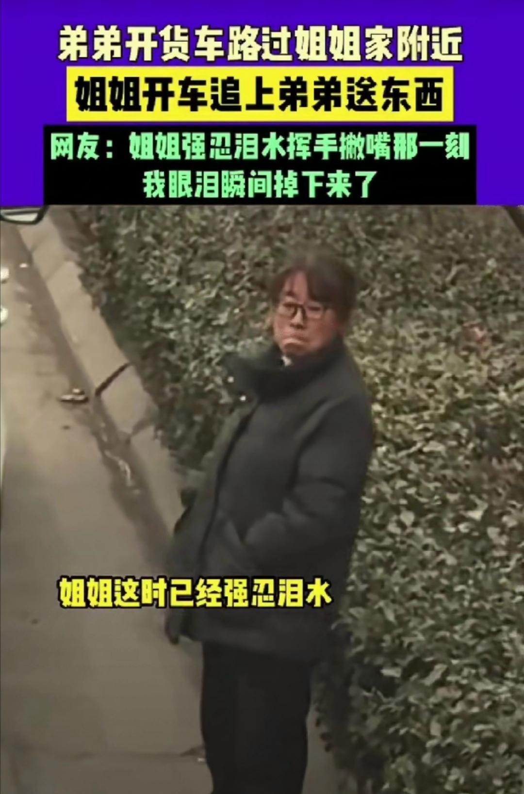 泪目了!山东,弟弟开货车路过姐姐家,本想只是匆匆路过,没打算停留,不料姐姐得知消息后竟立马开车追上去给弟弟送东西,最后强忍眼泪挥手撇嘴的样子,直接看哭全网。 弟弟是个长途货车司机,常年在路上跑,一年到头也回不了几次家。 这天他送货刚好路过姐姐家附近,就想着发消息问候一下姐姐,结果姐姐一听说,立马在家翻箱倒柜,把自己种的菜、换洗的衣服,还有路上能吃的零食、喝的水装了满满一大包,然后开车去追。 姐夫在旁边说:“他赶时间,你这能追上吗?”姐姐没理,拎着大包小包就上了车,凭着弟弟说的大致位置,沿着国道往前追。眼睛盯着路上的货车,生怕错过了。 追了大概十分钟,远远看见一辆熟悉的蓝色货车,车身上印着物流公司的名字,正是王强开的那辆。姐姐赶紧按喇叭,打双闪,弟弟从后视镜里看见,慢慢把车停在路边。 车门一打开,姐姐就把包往副驾塞:“刚烙的饼,凉了微波炉热下就能吃;鞋垫垫上,别冻着脚;西红柿路上解渴,蒜苔配面条吃……”絮絮叨叨说个不停,手还在包里翻,想再找点啥塞进去。 弟弟看着姐姐额头上的汗,眼眶有点热:“姐,我真赶时间,这些够了。”姐姐这才停住,摸了摸他的胳膊:“又瘦了,是不是没好好吃饭?” 说话间,弟弟手机响了,是货主催了。他赶紧发动车子:“姐,我走了啊。”姐姐点点头,往后退了两步,看着货车启动。 车子慢慢往前开,弟弟从后视镜里看,姐姐还站在原地,手挥着挥着,嘴一撇,眼泪掉了下来,却还在使劲挥手。他心里像被啥堵住了,猛吸了口气,不敢再看。 后来这段视频被弟弟同事发到网上,好多人看哭了。有人说“这就是姐姐啊,永远把你当孩子疼”,有人说“想起我哥跑长途,我妈也是这样,追着车塞吃的”。 弟弟说,那天晚上在服务区,热了姐姐烙的饼,就着蒜苔吃,眼泪掉在饼上,咸咸的,却比啥都香。他给姐姐发微信:“饼真好吃,下次路过一定回家住一晚。”姐姐回了个“好”,后面跟着个哭脸表情。 其实姐弟俩小时候总吵架,弟弟抢姐姐的作业本,姐姐藏他的玩具枪。可真长大了,才发现血浓于水的情分,藏在每一句唠叨里,每一次追车送的包裹里。就像弟弟说的:“不管跑多远,知道有人惦记着,牵挂着,再累都觉得值。” 现在弟弟跑车,总会提前告诉姐姐大致路线,能停就停一会儿,哪怕就说几句话。姐姐也不追车了,就在家做好吃的等着,知道弟弟平安,比啥都重要。 各位读者你们怎么看?欢迎在评论区讨论。