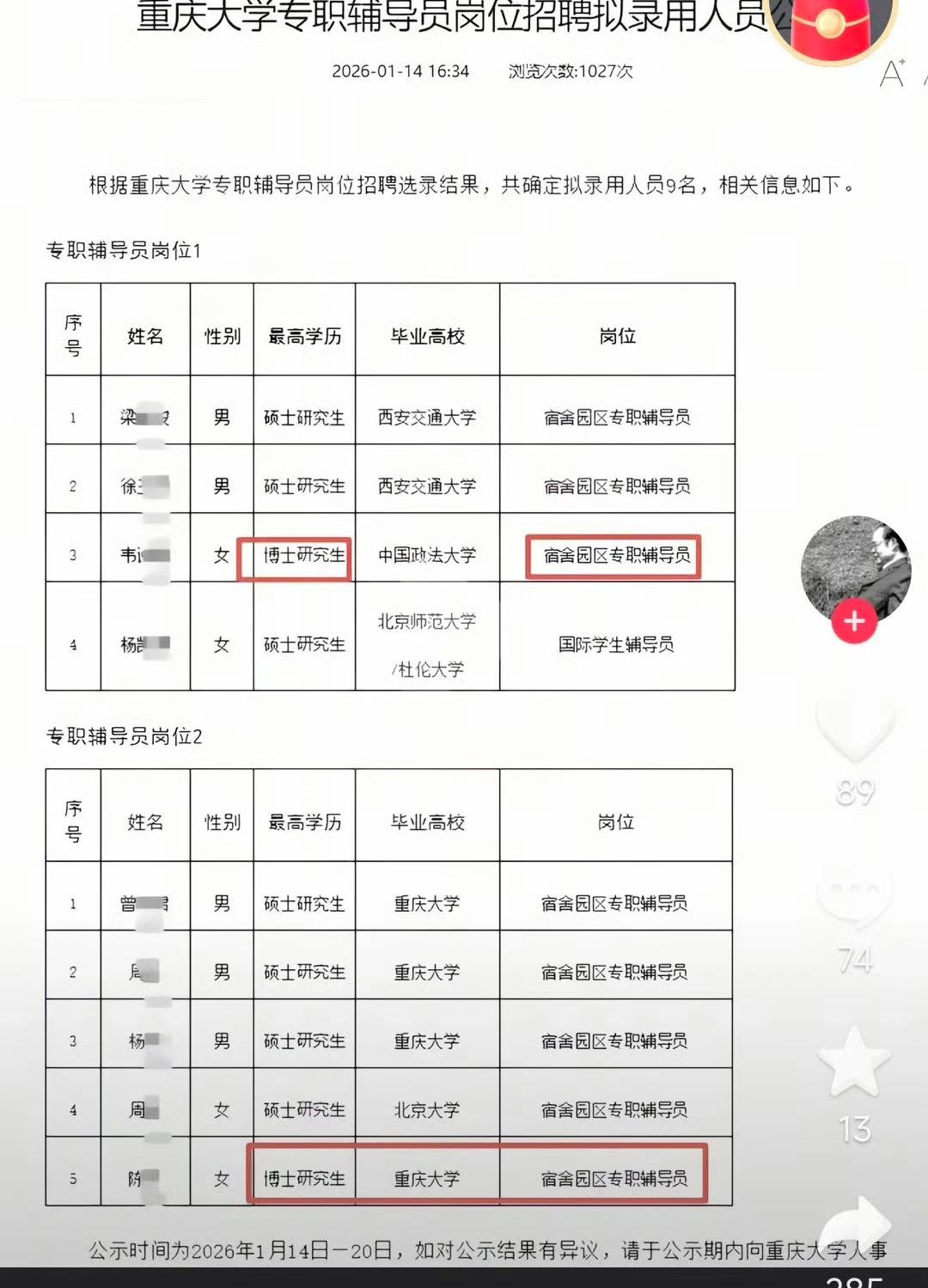 学历贬值的速度流星坠入大气层的速度都快,中国政法大学的博士都只能到大学做宿舍管理员,还是专职的,也就是说以后没有机会干别的的。要知道宿管员以前在学校都是大爷大妈在做,压根不要高学历。大学毕业生过剩严重,没有合适的工作,宿管员就成为香饽饽,都引来一堆高学历的人卷。政法大学 政法大学毕业 博士进高校