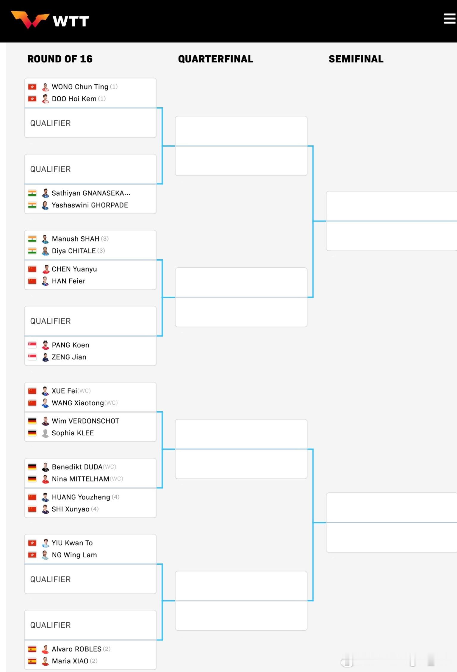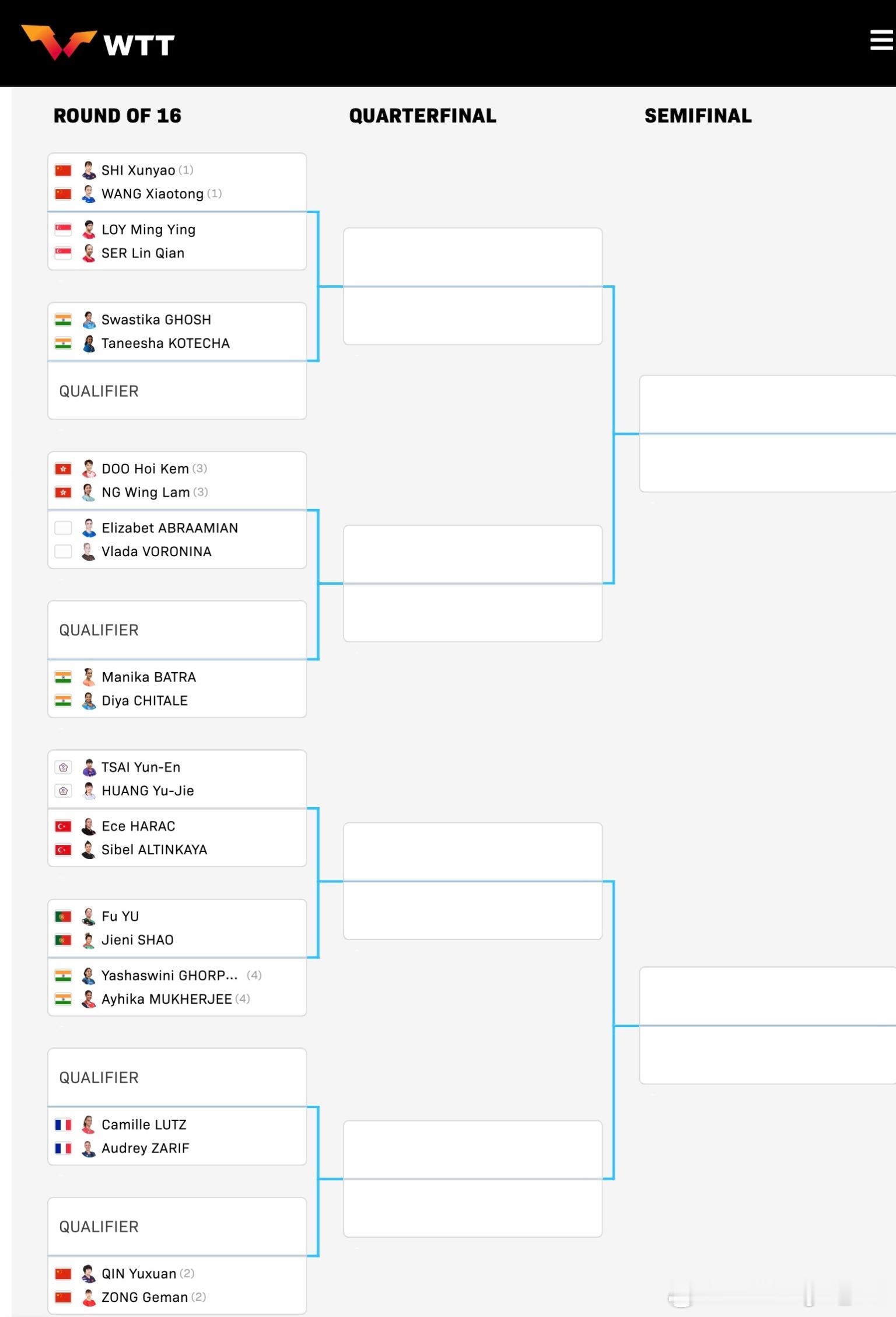 WTT常规挑战赛马斯喀特站2026 双打正赛签表: