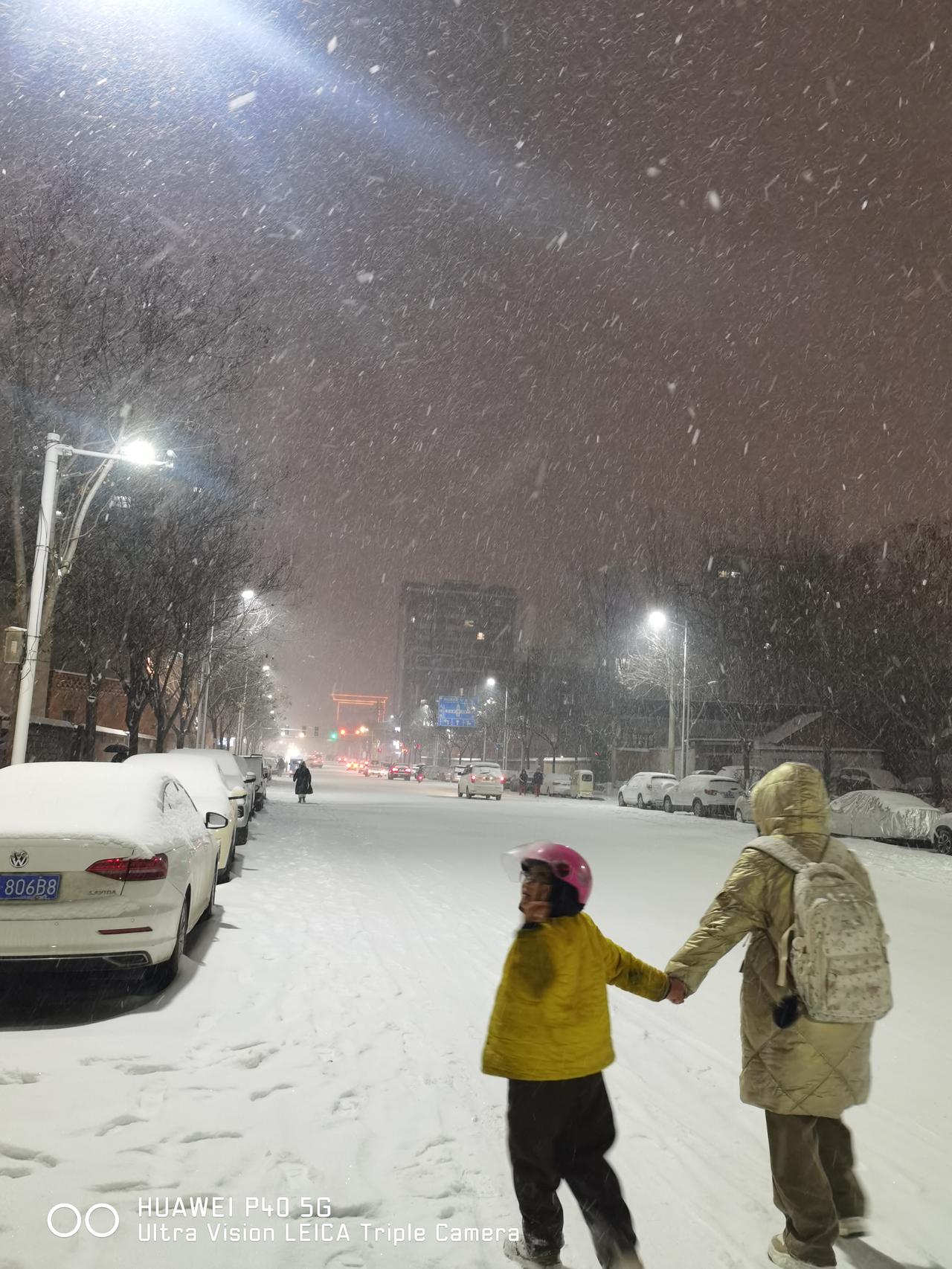 雪终于下来了,下的还很大,温度极低,化了的雪在头发上一会儿就变成了冰碴子。路的中间被车碾的平平的,走起来滑的像溜冰厂。 下午接到通知,今天没上学的小儿子明天还继续在家,傍晚陪他滑了一会儿雪低,可把他高兴坏了。 上高中的女儿也提前一个小时放晚自习,因为学校离家也不是太送,就和小儿子一起步行去接她。走在路上,雪纷纷扬扬飘落,虽然还是很冷,但我们一路有说有笑,反而心中暖暖的。 快到家时,女儿说雪景很美,用手机拍一下。我赶紧拍了几张。 也许,若干年后,我们都会怀念这个极平常的雪夜!