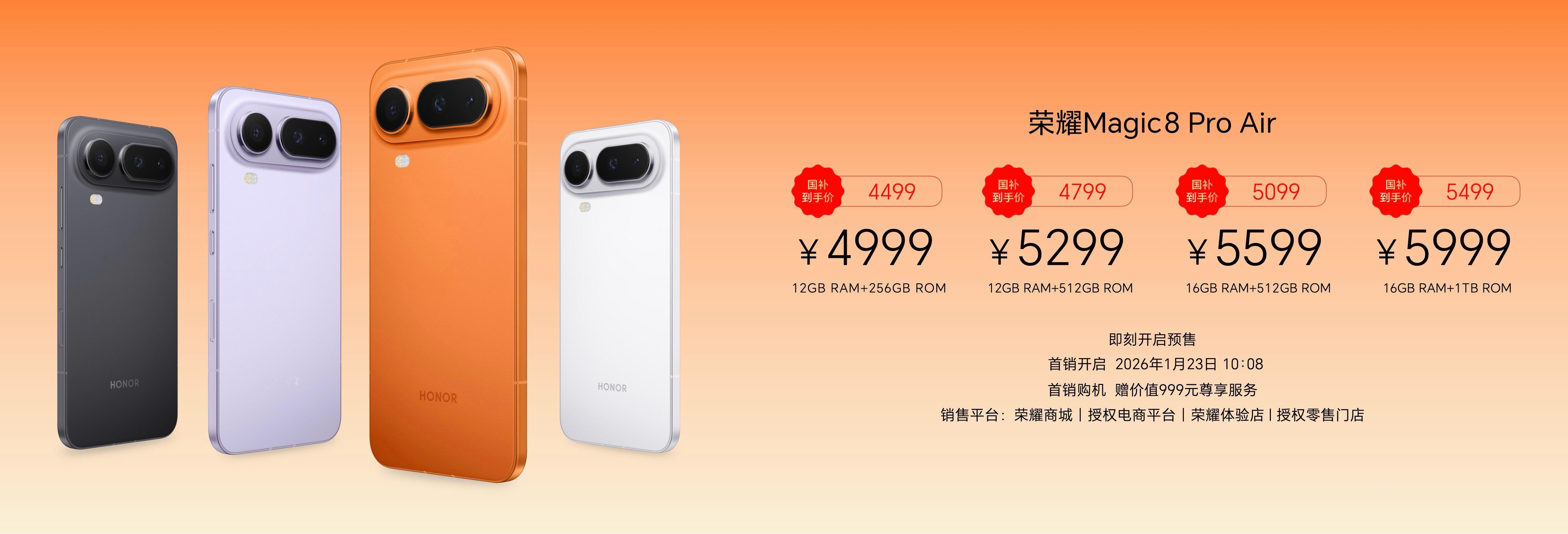 荣耀Magic8 Pro Air:12GB RAM+256GB ROM 售价4999 国补后到手价 4499 12GB RAM+512GB ROM 售价5299 国补后到手价 4799 16GB RAM+512GB ROM 售价5599 国补后到手价 5099 16GB RAM+1TB ROM 售价5999 国补后到手价 5499 荣耀500 Pro MOLLY 20周年限定版:16GB RAM+512GB ROM 售价4499元 国补后到手价 3999元荣耀Magic8 RSR(保时捷设计):16GB RAM+1TB ROM 售价7999 24GB RAM+1TB ROM 售价8999 你们觉得价格如何呢?荣耀Magic8ProAir是Pro还是Air 荣耀Magic8 Pro Air