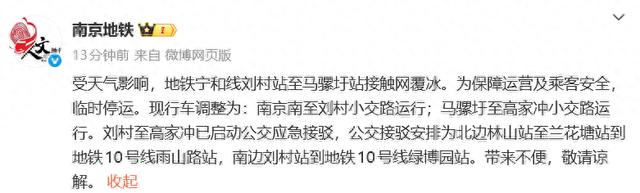 受天气影响,地铁宁和线刘村站至马骡圩站接触网覆冰。为保障运营及乘客安全,临时停运。
