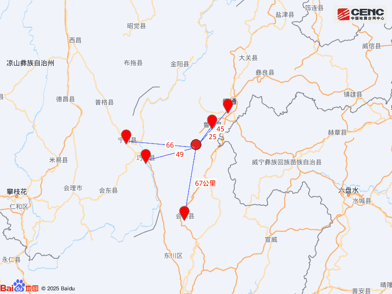 周边县城:震中距鲁甸县25公里、距昭阳区45公里、距巧家县49公里、距宁南县66公里、距会泽县67公里,距昭通市48公里,距昆明市230公里。