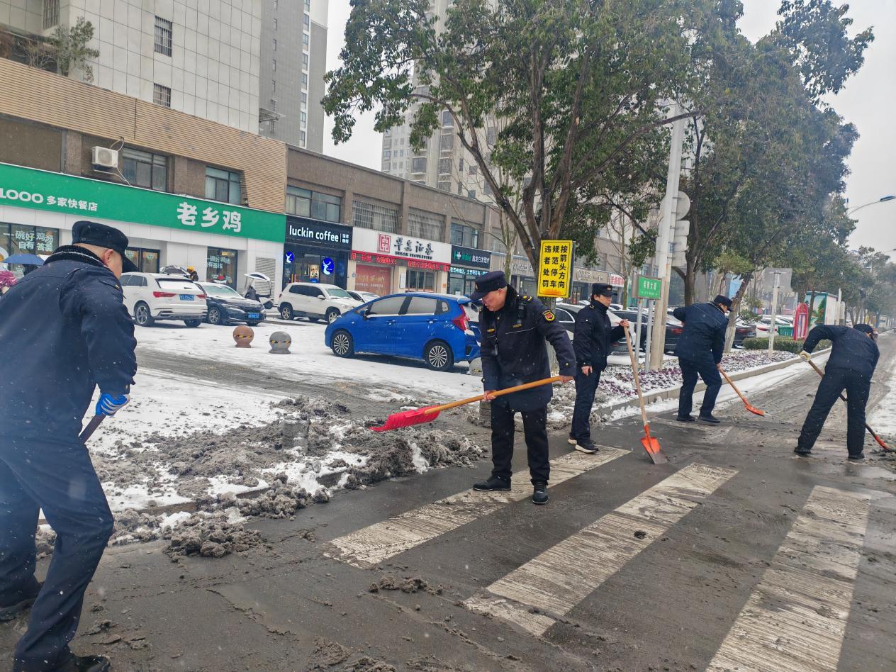 为凝聚全民清雪合力,区城管局积极发动社会力量参与,组织执法队员踏雪巡街,逐门逐户向沿街商户宣传“门前三包”责任,动员商户自主清理门前积雪。“您好,门前的雪咱们一起扫一扫,大家走路都安全!”一句句暖心的提醒,换来商户们的积极响应。商户们纷纷拿起工具,加入到清雪队伍中,形成“人人参与、共建共享”的良好氛围。截至目前,已有3500余家商户主动配合,完成门前积雪清理工作,让这场清雪行动成为全民参与的暖心实践。