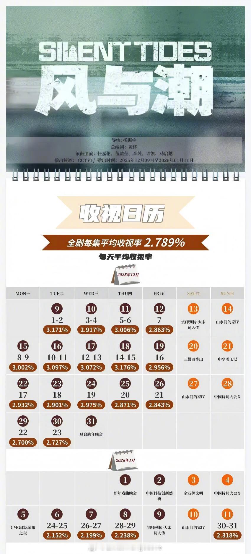 中国视听大数据CVB收视日历任嘉伦 / 蓝盈莹 / 李纯 / 谭凯 / 马启越 风与潮 平均收视率2.789%,最高单日3.176%(央一完结剧年度第十一名) 江奇霖 / 章宇 / 尹正 / 兰西雅 / 韩静 反人类暴行 平均收视率0.121%,最高单日0.194%(江苏卫视完结剧年度第十四名)